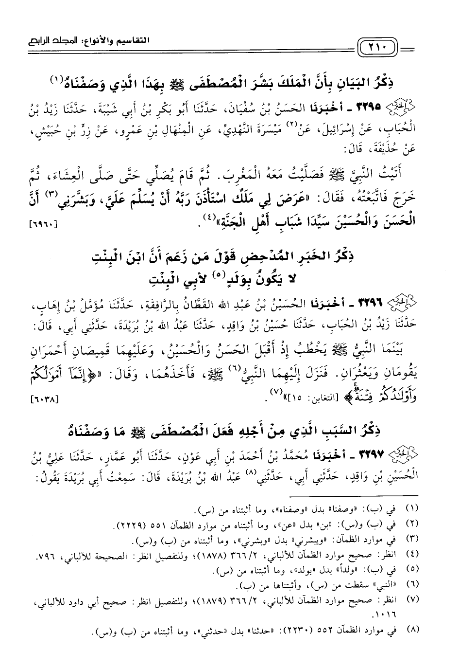 ٣٢٩٦ - أَخبَرنا الْحُسَيْنُ بْنُ عَبْدِ اللهِ الْقَطَّانُ، بِالرَّافِقَةِ، حَدثنا مُؤَمَّلُ بْنُ إِهَابٍ، حَدثنا زَيْدُ بْنُ الْحُبَابِ، حَدثنا حُسَيْنُ بْنُ وَاقِدٍ، حَدثنا عَبْدُ اللهِ بْنُ بُرَيْدَةَ، حَدَّثَنِي أَبِي، قَالَ: بَيْنَمَا النَّبِيُّ صَلى الله عَلَيه وسَلم يَخْطُبُ، إِذْ أَقْبَلَ الْحَسَنُ وَالْحُسَيْنُ وَعَلَيْهِمَا قَمِيصَانِ أَحْمَرَانِ يَقُومَانِ وَيَعْثُرَانِ، فَنَزَلَ إِلَيْهِمَا النَّبِيُّ صَلى الله عَلَيه وسَلم، فَأَخَذَهُمَا، وَقَالَ: {إِنَّمَا أَمْوَالُكُمْ وَأَوْلَادُكُمْ فِتْنَةٌ} [التغابن: ١٥]. [٦٠٣٨]