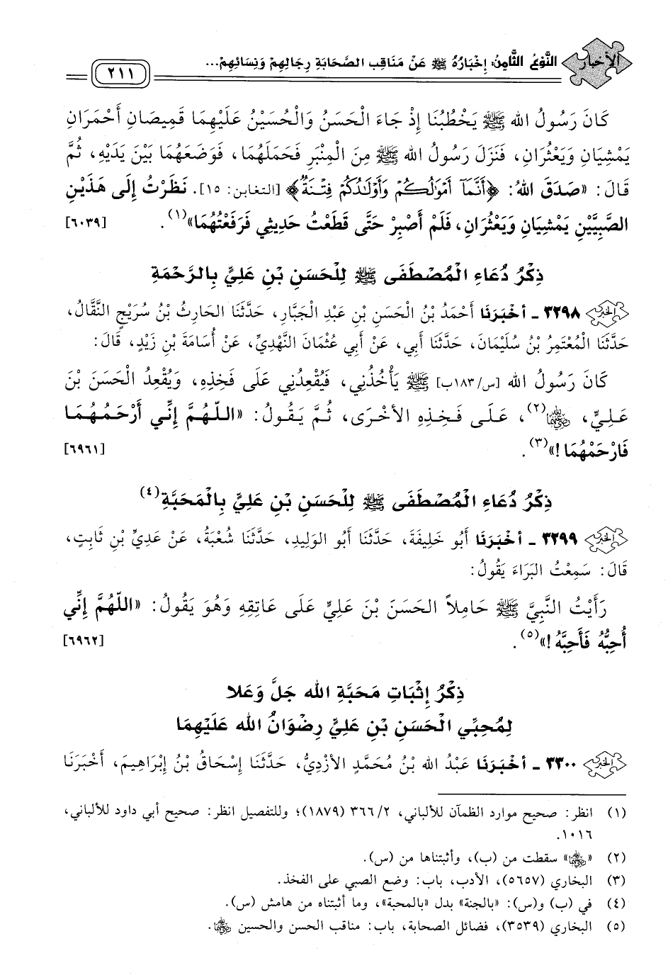 ٣٢٩٨ - أَخبَرنا أَحْمَدُ بْنُ الْحَسَنِ بْنِ عَبْدِ الْجَبَّارِ، حَدثنا الْحَارِثُ بْنُ سُرَيْجٍ النَّقَالُ، حَدثنا الْمُعْتَمِرُ بْنُ سُلَيْمَانَ، حَدثنا أَبِي، عَنْ أَبِي عُثْمَانَ النَّهْدِيِّ، عَنْ أُسَامَةَ بْنِ زَيْدٍ، قَالَ: كَانَ رَسُولُ اللهِ صَلى الله عَلَيه وسَلم يَأْخُذُنِي فَيُقْعِدُنِي عَلَى فَخِذِهِ، وَيُقْعِدُ الْحَسَنَ بْنَ عَلِيٍّ رضي الله عنهما عَلَى فَخِذِهِ الأُخْرَى، ثُمَّ يَقُولُ: "اللهُمَّ إِنِّي أَرْحَمُهُمَا فَارْحَمْهُمَا". [٦٩٦١]