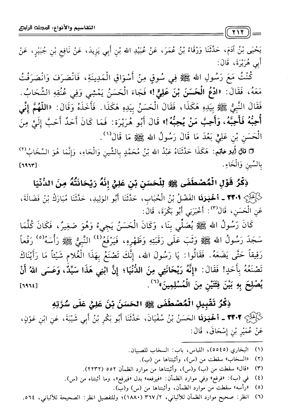 ٣٣٠١ - أَخبَرنا الْفَضْلُ بْنُ الْحُبَابِ، حَدثنا أَبُو الْوَلِيدِ، حَدثنا مُبَارَكُ بْنُ فَضَالَةَ، عَنِ الْحَسَنِ، قال: أَخْبَرَنِي أَبُو بَكْرَةَ، قَالَ: كَانَ رَسُولُ اللهِ صَلى الله عَلَيه وسَلم يُصَلِّي بِنَا، وَكَانَ الْحَسَنُ يَجِيءُ وَهُوَ صَغِيرٌ، فَكَانَ كُلَّمَا سَجَدَ رَسُولُ اللهِ صَلى الله عَلَيه وسَلم وَثَبَ عَلَى رَقَبَتِهِ وَظَهْرِهِ، فَيَرْفَعُ النَّبِيُّ صَلى الله عَلَيه وسَلم رَأْسَهُ رَفْعًا رَقِيقًا حَتَّى يَضَعَهُ، فَقَالُوا: يَا رَسُولَ اللهِ، إِنَّكَ تَصْنَعُ بِهَذَا الْغُلَامِ شَيْئًا مَا رَأَيْنَاكَ تَصْنَعُهُ بِأَحَدٍ، فَقَالَ: "إِنَّهُ رَيْحَانَتِي مِنَ الدُّنْيَا، إِنَّ ابْنِي هَذَا سَيِّدٌ، وَعَسَى اللهُ أَنْ يُصْلِحَ بِهِ بَيْنَ فِئَتَيْنِ مِنَ الْمُسْلِمِينَ". [٦٩٦٤]