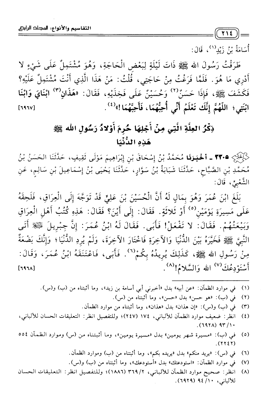 ٣٣٠٥ - أَخبَرنا مُحَمَّدُ بْنُ إِسْحَاقَ بْنِ إِبْرَاهِيمَ، مَوْلَى ثَقِيفٍ، حَدثنا الْحَسَنُ بْنُ مُحَمَّدِ بْنِ الصَّبَّاحِ، حَدثنا شَبَابَةُ بْنُ سَوَّارٍ، حَدثنا يَحْيَى بْنُ إِسْمَاعِيلَ بْنِ سَالِمٍ، عَنِ الشَّعْبِيِّ، قَالَ: بَلَغَ ابْنَ عُمَرَ وَهُوَ بِمَالٍ لَهُ أَنَّ الْحُسَيْنَ بْنَ عَلِيٍّ، قَدْ تَوَجَّهَ إِلَى الْعِرَاقِ، فَلَحِقَهُ عَلَى مَسِيرَةِ يَوْمَيْنِ، أَوْ ثَلَاثَةٍ، فَقَالَ: إِلَى أَيْنَ؟ فَقَالَ: هَذِهِ كُتُبُ أَهْلِ الْعِرَاقِ وَبَيْعَتُهُمْ، فَقَالَ: لَا تَفْعَلْ، فَأَبَى، فَقَالَ لَهُ ابْنُ عُمَرَ: إِنَّ جِبْرِيلَ عَلَيْهِ السَّلَامُ أَتَى النَّبِيَّ صَلى الله عَلَيه وسَلم فَخَيَّرَهُ بَيْنَ الدُّنْيَا وَالآخِرَةِ، فَاخْتَارَ الآخِرَةَ، وَلَمْ يُرِدِ الدُّنْيَا، وَإِنَّكَ بَضْعَةٌ مِنْ رَسُولِ اللهِ صَلى الله عَلَيه وسَلم، كَذَلِكَ يُرِيدُهُ بِكُمْ، فَأَبَى، فَاعْتَنَقَهُ ابْنُ عُمَرَ، وَقَالَ: أَسْتَوْدِعُكَ اللهَ، وَالسَّلَامُ. [٦٩٦٨]