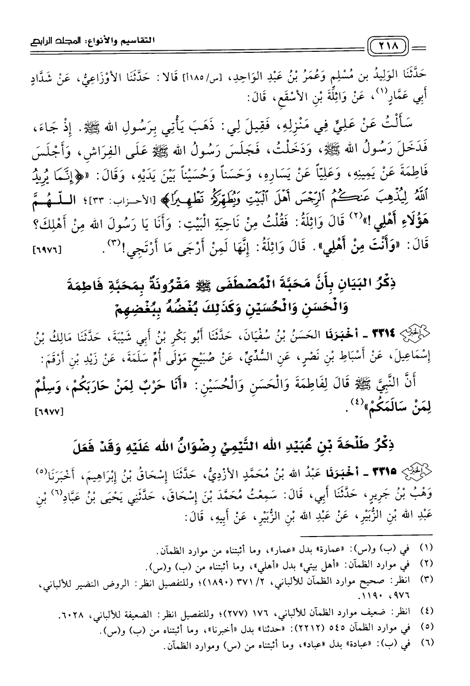 ٣٣١٤ - أَخبَرنا الْحَسَنُ بْنُ سُفْيَانَ، حَدثنا أَبُو بَكْرِ بْنُ أَبِي شَيْبَةَ، حَدثنا مَالِكُ بْنُ إِسْمَاعِيلَ، عَنْ أَسْبَاطِ بْنِ نَصْرٍ، عَنِ السُّدِّيِّ، عَنْ صُبَيْحٍ مَوْلَى أُمِّ سَلَمَةَ، عَنْ زَيْدِ بْنِ أَرْقَمَ، أَنَّ النَّبِيَّ صَلى الله عَلَيه وسَلم، قَالَ لِفَاطِمَةَ وَالْحَسَنِ وَالْحُسَيْنِ: "أَنَا حَرْبٌ لِمَنْ حَارَبَكُمْ، وَسَلْمٌ لِمَنْ سَالَمَكُمْ". [٦٩٧٧]