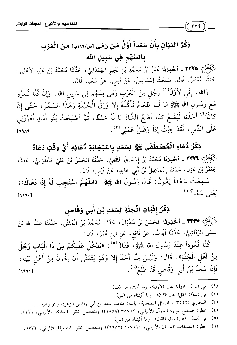 ذِكْرُ الْبَيَانِ بِأَنَّ سَعْدًا أَوَّلُ مَنْ رَمَى مِنَ الْعَرَبِ بِالسَّهْمِ فِي سَبِيلِ اللهِ.