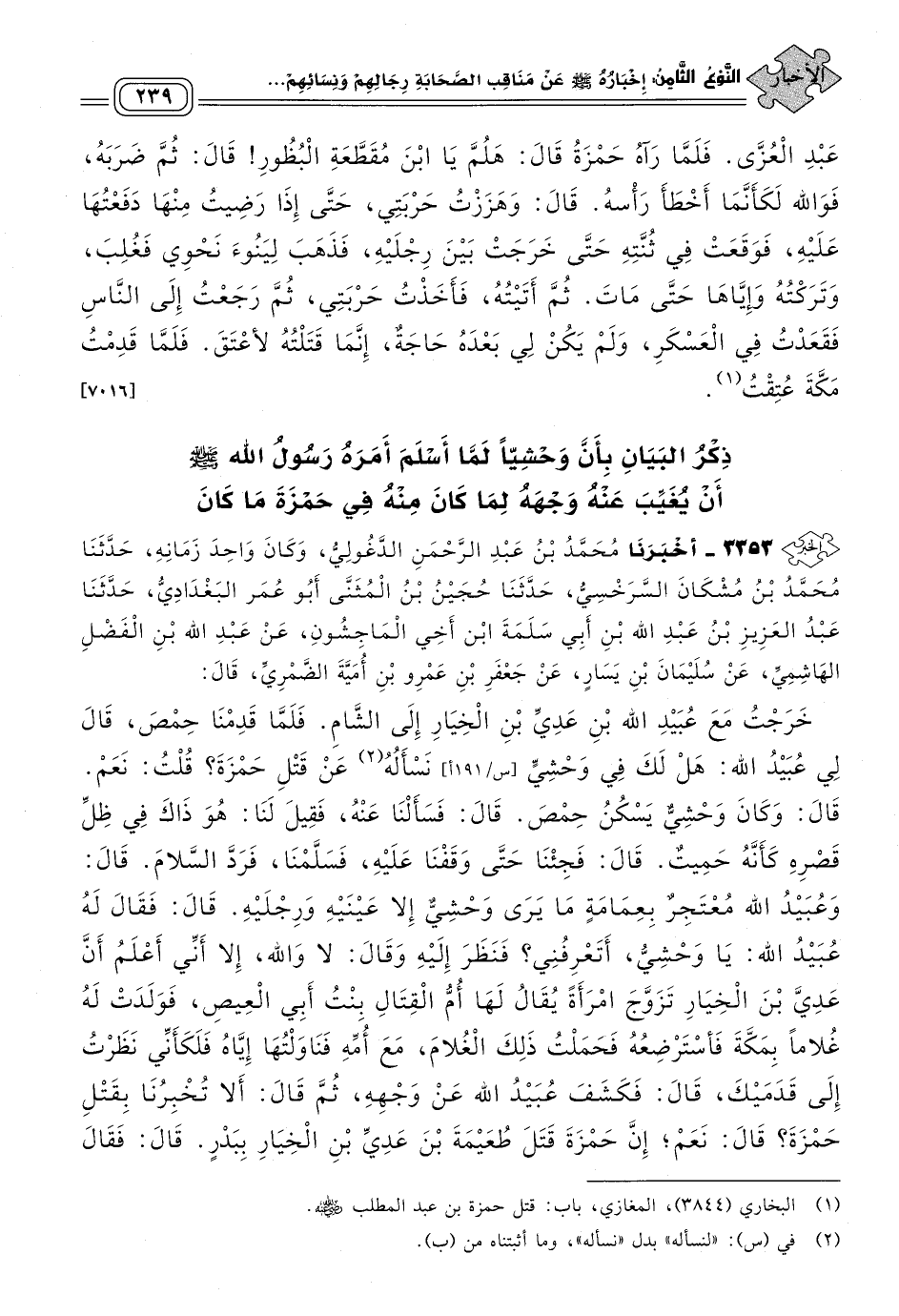 ٣٣٥٣ - أَخبَرنا مُحَمَّدُ بْنُ عَبْدِ الرَّحْمَنِ الدَّغُولِيُّ، وَكَانَ وَاحِدَ زَمَانِهِ، حَدثنا مُحَمَّدُ بْنُ مُشْكَانَ السَّرَخْسِيُّ، حَدثنا حُجَيْنُ بْنُ الْمُثَنَّى أَبُو عُمَرَ الْبَغْدَادِيُّ، حَدثنا عَبْدُ الْعَزِيزِ بْنُ عَبْدِ اللهِ بْنِ أَبِي سَلَمَةَ ابْنِ أَخِي الْمَاجِشُونِ، عَنْ عَبْدِ اللهِ بْنِ الْفَضْلِ الْهَاشِمِيِّ، عَنْ سُلَيْمَانَ بْنِ يَسَارٍ، عَنْ جَعْفَرِ بْنِ عَمْرِو بْنِ أُمَيَّةَ الضَّمْرِيِّ، قَالَ: خَرَجْتُ مَعَ عُبَيْدِ اللهِ بْنِ عَدِيِّ بْنِ الْخِيَارِ إِلَى الشَّامِ، فَلَمَّا قَدِمْنَا حِمْصَ، قَالَ لِي عُبَيْدُ اللهِ: هَلْ لَكَ فِي وَحْشِيٍّ نَسْأَلُهُ عَنْ قَتْلِ حَمْزَةَ؟ قُلْتُ: نَعَمْ، قَالَ: وَكَانَ وَحْشِيٌّ يَسْكُنُ حِمْصَ، قَالَ: فَسَأَلْنَا عَنْهُ، فَقِيلَ لَنَا: هُوَ ذَاكَ فِي ظِلِّ قَصْرِهِ، كَأَنَّهُ حَمِيتٌ، قَالَ: فَجِئْنَا حَتَّى وَقَفْنَا عَلَيْهِ، فَسَلَّمْنَا فَرَدَّ السَّلَامَ، قَالَ: وَعُبَيْدُ اللهِ مُعْتَجِرٌ بِعِمَامَةٍ مَا يَرَى وَحْشِيٌّ إِلَاّ عَيْنَيْهِ وَرِجْلَيْهِ، قَالَ: فَقَالَ لَهُ عُبَيْدُ اللهِ: يَا وَحْشِيُّ، أَتَعْرِفُنِي؟