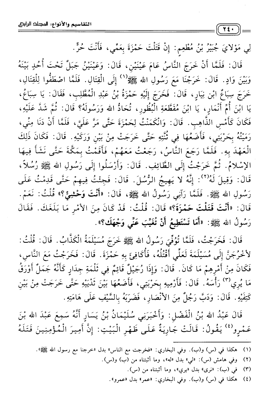 فَنَظَرَ إِلَيْهِ، وَقَالَ: لَا وَاللهِ إِلَاّ أَنِّي أَعْلَمُ أَنَّ عَدِيَّ بْنَ الْخِيَارِ تَزَوَّجَ امْرَأَةً يُقَالُ لَهَا: أُمُّ الْقِتَالِ بِنْتُ أَبِي الْعِيصِ، فَوَلَدَتْ لَهُ غُلَامًا بِمَكَّةَ فَاسْتَرْضَعَهُ، فَحَمَلْتُ ذَلِكَ الْغُلَامَ مَعَ أُمِّهِ فَنَاوَلْتُهَا إِيَّاهُ، فَلَكَأَنِّي نَظَرْتُ إِلَى قَدَمَيْكَ، قَالَ: فَكَشَفَ عُبَيْدُ اللهِ عَنْ وَجْهِهِ، ثُمَّ قَالَ: أَلَا تُخْبِرُنَا بِقَتْلِ حَمْزَةَ؟ قَالَ: نَعَمْ، إِنَّ حَمْزَةَ قَتَلَ طُعَيْمَةَ بْنَ عَدِيِّ بْنِ الْخِيَارِ بِبَدْرٍ، قَالَ: فَقَالَ لِي مَوْلَايَ جُبَيْرُ بْنُ مُطْعَمٍ: إِنْ قَتَلْتَ حَمْزَةَ بِعَمِّي فَأَنْتَ حُرٌّ، قَالَ: فَمَا أَنْ خَرَجَ النَّاسُ عَامَ عَيْنَيْنِ، قَالَ: وَعَيْنَيْنُ جَبَلٌ تَحْتَ أُحُدٍ، بَيْنَهُ وَبَيْنَ وَادٍ، قَالَ: خَرَجْنا مَعَ رسول الله صلى الله عليه وسلم إِلَى الْقِتَالِ، فَلَمَّا اصْطَفُّوا لِلْقِتَالِ، خَرَجَ سِبَاعٌ أَبُو نِيَارٍ، قَالَ: فَخَرَجَ إِلَيْهِ حَمْزَةُ بْنُ عَبْدِ الْمُطَّلِبِ، فَقَالَ: يَا سِبَاعُ، يَا ابْنَ أُمِّ أَنْمَارٍ، يَا ابْنَ مُقَطِّعَةِ الْبُظُورِ، تُحَادُّ اللهَ وَرَسُولَهُ؟ قَالَ: ثُمَّ شَدَّ عَلَيْهِ، فَكَانَ كَأَمْسِ الذَّاهِبِ، قَالَ: وَانْكَمَنْتُ لِحَمْزَةَ حَتَّى مَرَّ عَلَيَّ، فَلَمَّا أَنْ دَنَا مِنِّي رَمَيْتُهُ بِحَرْبَتِي، فَأَضَعُهَا فِي ثُنَّتِهِ حَتَّى خَرَجَتْ مِنْ بَيْنَ وَرِكَيْهِ، قَالَ: فَكَانَ ذَلِكَ الْعَهْدُ بِهِ، فَلَمَّا رَجَعَ النَّاسُ، رَجَعْتُ مَعَهُمْ، فَأَقَمْتُ بِمَكَّةَ حَتَّى نَشَأَ فِيهَا الإِسْلَامُ، ثُمَّ خَرَجْتُ إِلَى الطَّائِفِ، قَالَ: وَأَرْسَلُوا إِلَى رَسُولِ اللهِ صَلى الله عَلَيه وسَلم رُسُلاً،