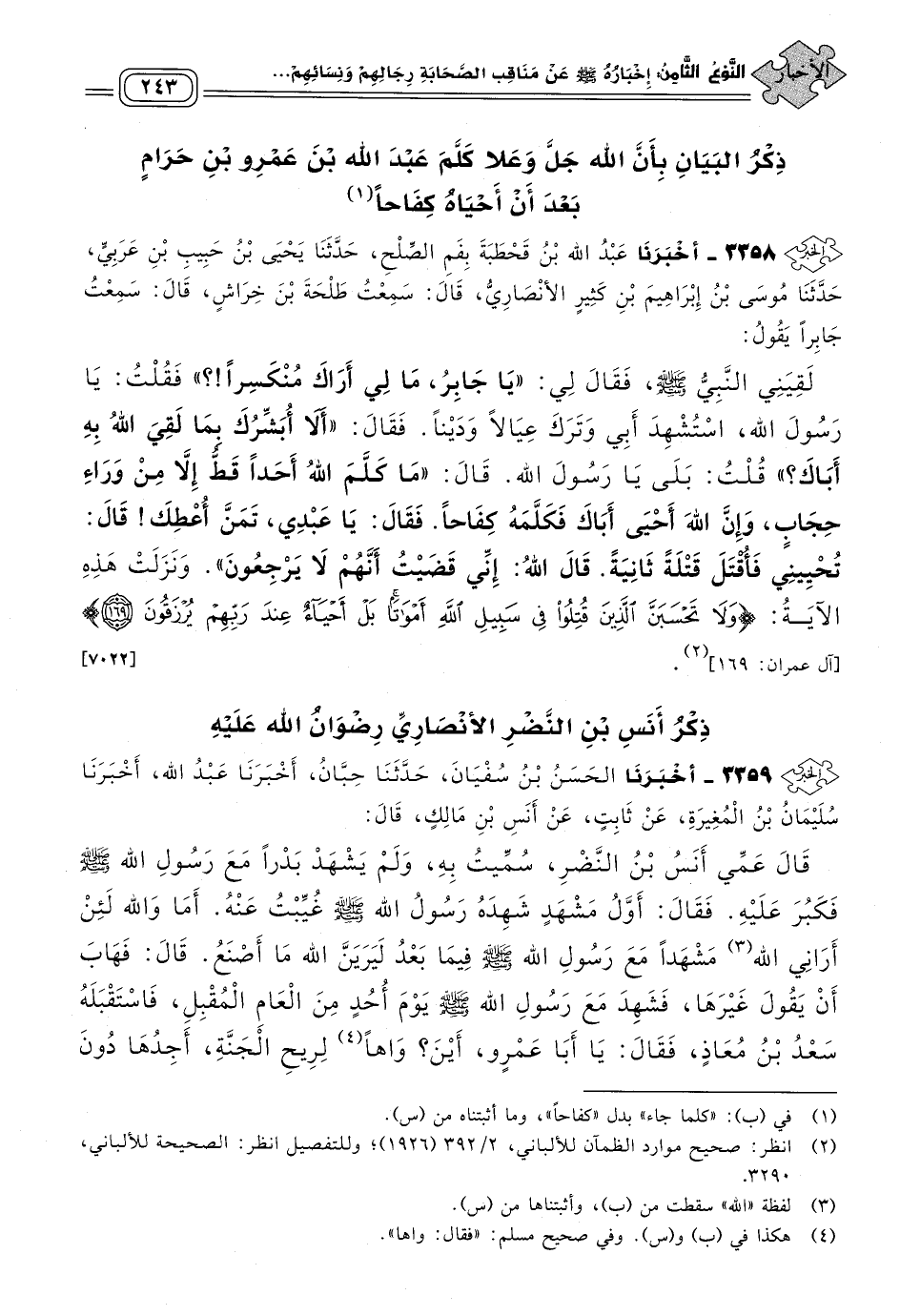 ٣٣٥٨ - أَخبَرنا عَبْدُ اللهِ بْنُ قَحْطَبَةَ، بِفَمِ الصِّلْحِ، حَدثنا يَحْيَى بْنُ حَبِيبِ بْنِ عَرَبِيٍّ، حَدثنا مُوسَى بْنُ إِبْرَاهِيمَ بْنِ كَثِيرٍ الأَنْصَارِيُّ، قَالَ: سَمِعْتُ طَلْحَةَ بْنَ خِرَاشٍ، قَالَ: سَمِعْتُ جَابِرًا، يَقُولُ: لَقِيَنِي النَّبِيُّ صَلى الله عَلَيه وسَلم، فَقَالَ لِي: "يَا جَابِرُ، مَا لِي أَرَاكَ مُنْكَسِرًا؟ " فَقُلْتُ: يَا رَسُولَ اللهِ، اسْتُشْهِدَ أَبِي، وَتَرَكَ عِيَالاً وَدَيْنًا، فَقَالَ: "أَلَا أُبَشِّرُكَ بِمَا لَقِيَ اللهُ بِهِ أَبَاكَ؟ " قُلْتُ: بَلَى يَا رَسُولَ اللهِ، قَالَ: "مَا كَلَّمَ اللهُ أَحَدًا قَطُّ إِلَاّ مِنْ وَرَاءِ حِجَابٍ، وَإِنَّ اللهَ أَحْيَى أَبَاكَ فَكَلَّمَهُ كِفَاحًا، فَقَالَ: يَا عَبْدِي، تَمَنَّ أُعْطِكَ، قَالَ: تُحْيِينِي فَأُقْتَلَ قَتْلَةً ثَانِيَةً، قَالَ اللهُ: إِنِّي قَضَيْتُ أَنَّهُمْ لَا يَرْجِعُونَ"، وَنَزَلَتْ هَذِهِ الآيَةُ: {وَلَا تَحْسَبَنَّ الَّذِينَ قُتِلُوا فِي سَبِيلِ اللهِ أَمْوَاتًا بَلْ أَحْيَاءٌ عِنْدَ رَبِّهِمْ يُرْزَقُونَ} [آل عمران: ١٦٩]. [٧٠٢٢]
