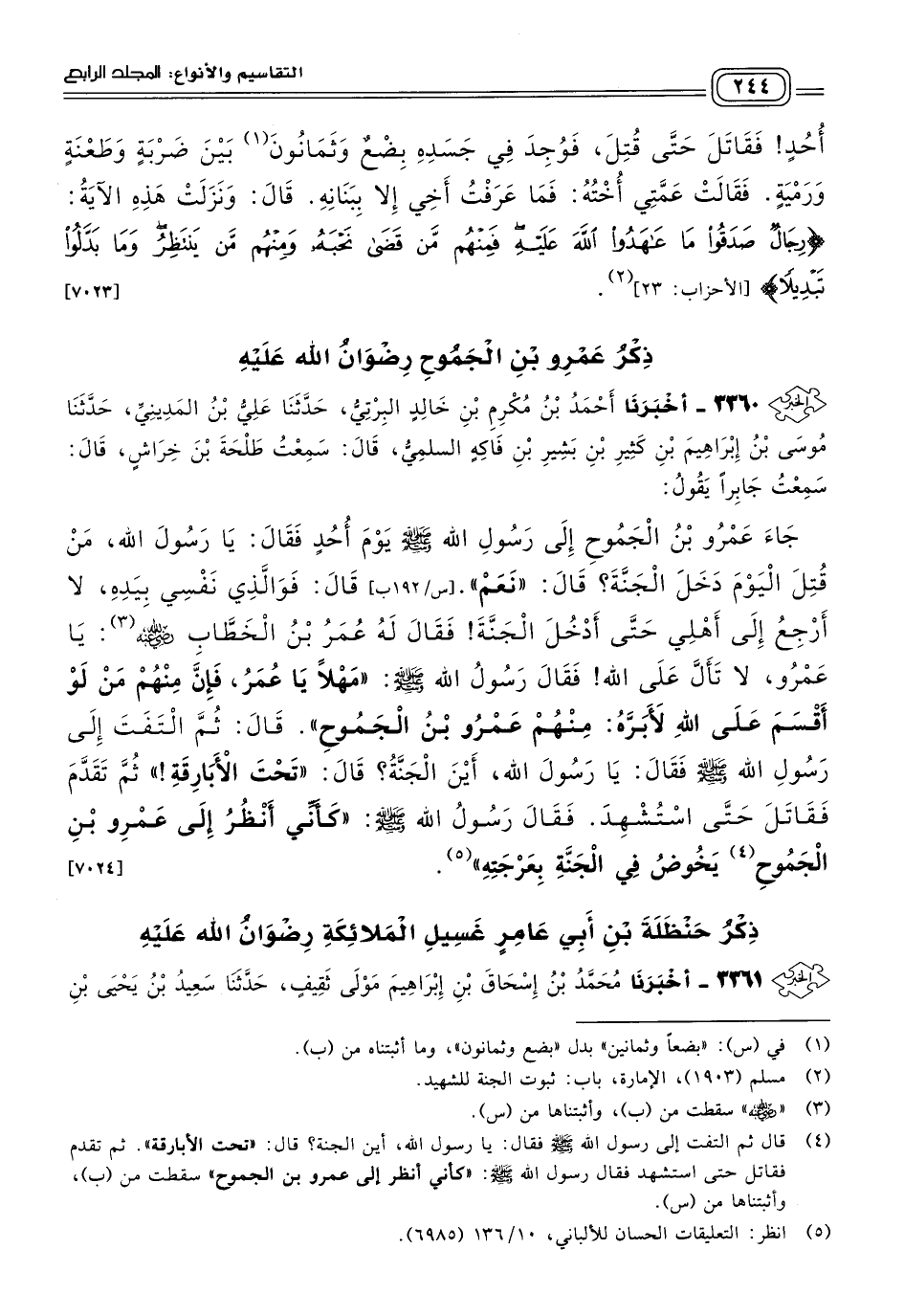 ٣٣٦٠ - أَخبَرنا أَحْمَدُ بْنُ مُكْرَمِ بْنِ خَالِدٍ الْبَرْتِيُّ، حَدثنا عَلِيُّ بْنُ الْمَدِينِيِّ، حَدثنا مُوسَى بْنُ إِبْرَاهِيمَ بْنِ كَثِيرِ بْنِ بَشِيرِ بْنِ فَاكِهٍ السُّلَمِيُّ، قَالَ: سَمِعْتُ طَلْحَةَ بْنَ خِرَاشٍ، قَالَ: سَمِعْتُ جَابِرًا، يَقُولُ: جَاءَ عَمْرُو بْنُ الْجَمُوحِ إِلَى رَسُولِ اللهِ صَلى الله عَلَيه وسَلم يَوْمَ أُحُدٍ، فَقَالَ: يَا رَسُولَ اللهِ، مَنْ قُتِلَ الْيَوْمَ دَخَلَ الْجَنَّةَ؟ قَالَ: "نَعَمْ"، قَالَ: فَوَالَّذِي نَفْسِي بِيَدِهِ، لَا أَرْجِعُ إِلَى أَهْلِي حَتَّى أَدْخُلَ الْجَنَّةَ، فَقَالَ لَهُ عُمَرُ بْنُ الْخَطَّابِ رَضِيَ اللهُ عَنْهُ: يَا عَمْرُو، لَا تَألَّ عَلَى اللهِ، فَقَالَ رَسُولُ اللهِ صَلى الله عَلَيه وسَلم: "مَهْلاً يَا عُمَرُ، فَإِنَّ مِنْهُمْ مَنْ لَوْ أَقْسَمَ عَلَى اللهِ لأَبَرَّهُ: مِنْهُمْ عَمْرُو بْنُ الْجَمُوحِ". قال: ثم التفت إلى رسول الله صلى الله عليه وسلم فقال: يا رسول الله، أين الجنة؟ قال: "تحت الأبارقة" ثم تقدم فقاتل حتى استشهد. فقال رسول الله صلى الله عليه وسلم:"كأني أنظر إلى عمرو بن الجموح يَخُوضُ فِي الْجَنَّةِ بِعَرْجَتِهِ". [٧٠٢٤]