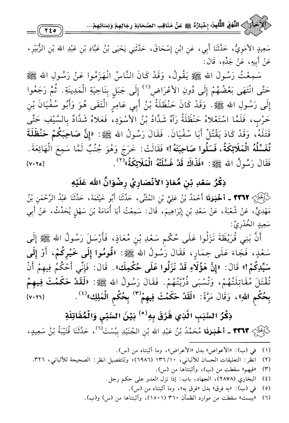 ٣٣٦٢ - أَخبَرنا أَحْمَدُ بْنُ عَلِيِّ بْنِ الْمُثَنَّى، حَدثنا أَبُو خَيْثَمَةَ، حَدثنا عَبْدُ الرَّحْمَنِ بْنُ مَهْدِيٍّ، عَنْ شُعْبَةَ، عَنْ سَعْدِ بْنِ إِبْرَاهِيمَ، قَالَ: سَمِعْتُ أَبَا أُمَامَةَ بْنَ سَهْلٍ يُحَدِّثُ، عَنْ أَبِي سَعِيدٍ الْخُدْرِيِّ، أَنَّ بَنِي قُرَيْظَةَ نَزَلُوا عَلَى حُكْمِ سَعْدِ بْنِ مُعَاذٍ، فَأَرْسَلَ رَسُولُ اللهِ صَلى الله عَلَيه وسَلم إِلَى سَعْدٍ، فَجَاءَ عَلَى حِمَارٍ، فَقَالَ رَسُولُ اللهِ صَلى الله عَلَيه وسَلم: "قُومُوا إِلَى خَيْرِكُمْ، أَوْ إِلَى سَيِّدِكُمْ"، قَالَ: "إِنَّ هَؤُلَاءِ قَدْ نَزَلُوا عَلَى حُكْمِكَ"، قَالَ: فَإِنِّي أَحْكُمُ فِيهِمْ أَنْ تُقْتَلَ مُقَاتِلَتُهُمْ، وَتُسْبَى ذَرِّيَّتُهُمْ، فَقَالَ رَسُولُ اللهِ صَلى الله عَلَيه وسَلم: "لَقَدْ حَكَمْتَ فِيهِمْ بِحُكْمِ اللهِ"، وَقَالَ مَرَّةً: "لَقَدْ حَكَمْتَ فيهم بِحُكْمِ الْمَلِكِ". [٧٠٢٦]