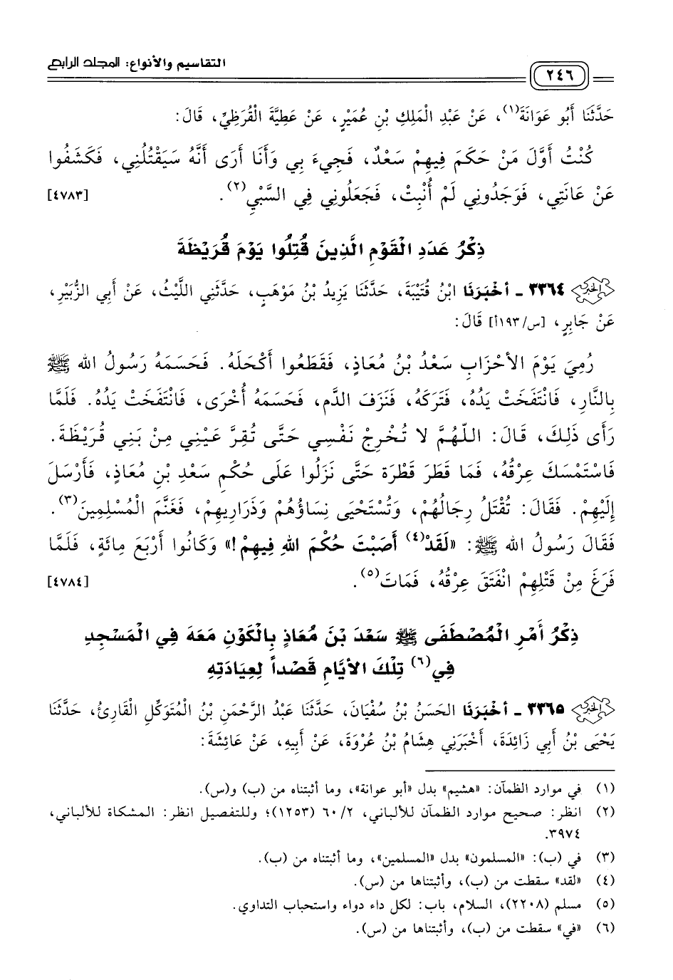 ٣٣٦٤ - أَخبَرنا ابْنُ قُتَيْبَةَ، حَدثنا يَزِيدُ بْنُ مَوْهَبٍ، حَدَّثَنِي اللَّيْثُ، عَنْ أَبِي الزُّبَيْرِ، عَنْ جَابِرٍ، قَالَ: رُمِيَ يَوْمَ الأَحْزَابِ سَعْدُ بْنُ مُعَاذٍ، فَقَطَعُوا أَكْحَلَهُ، فَحَسَمَهُ رَسُولُ اللهِ صَلى الله عَلَيه وسَلم بِالنَّارِ، فَانْتَفَخَتْ يَدُهُ، فَتَرَكَهُ فَنَزَفَ الدَّمُ، فَحَسَمَهُ أُخْرَى، فَانْتَفَخَتْ يَدُهُ، فَلَمَّا رَأَى ذَلِكَ قَالَ: اللهُمَّ لَا تُخْرِجْ نَفْسِي، حَتَّى تُقِرَّ عَيْنِي مِنْ بَنِي قُرَيْظَةَ، فَاسْتَمْسَكَ عِرْقُهُ، فَمَا قَطَرَ قَطْرَةً حَتَّى نَزَلُوا عَلَى حُكْمِ سَعْدِ بْنِ مُعَاذٍ، فَأَرْسَلَ إِلَيْهِمْ، فَقَالَ: تُقْتَلُ رِجَالُهُمْ، وَتُسْتَحْيَى نِسَاؤُهُمْ، وَذَرَارِيُّهُمْ، فَغَنَّمَ الْمُسْلِمِينَ، فَقَالَ رَسُولُ اللهِ صَلى الله عَلَيه وسَلم: "لقد أَصَبْتَ حُكْمَ اللهِ فِيهِمْ"، وَكَانُوا أَرْبَعَ مِائَةٍ، فَلَمَّا فَرَغَ مِنْ قَتْلِهِمْ، انْفَتَقَ عِرْقُهُ فَمَاتَ. [٤٧٨٤]