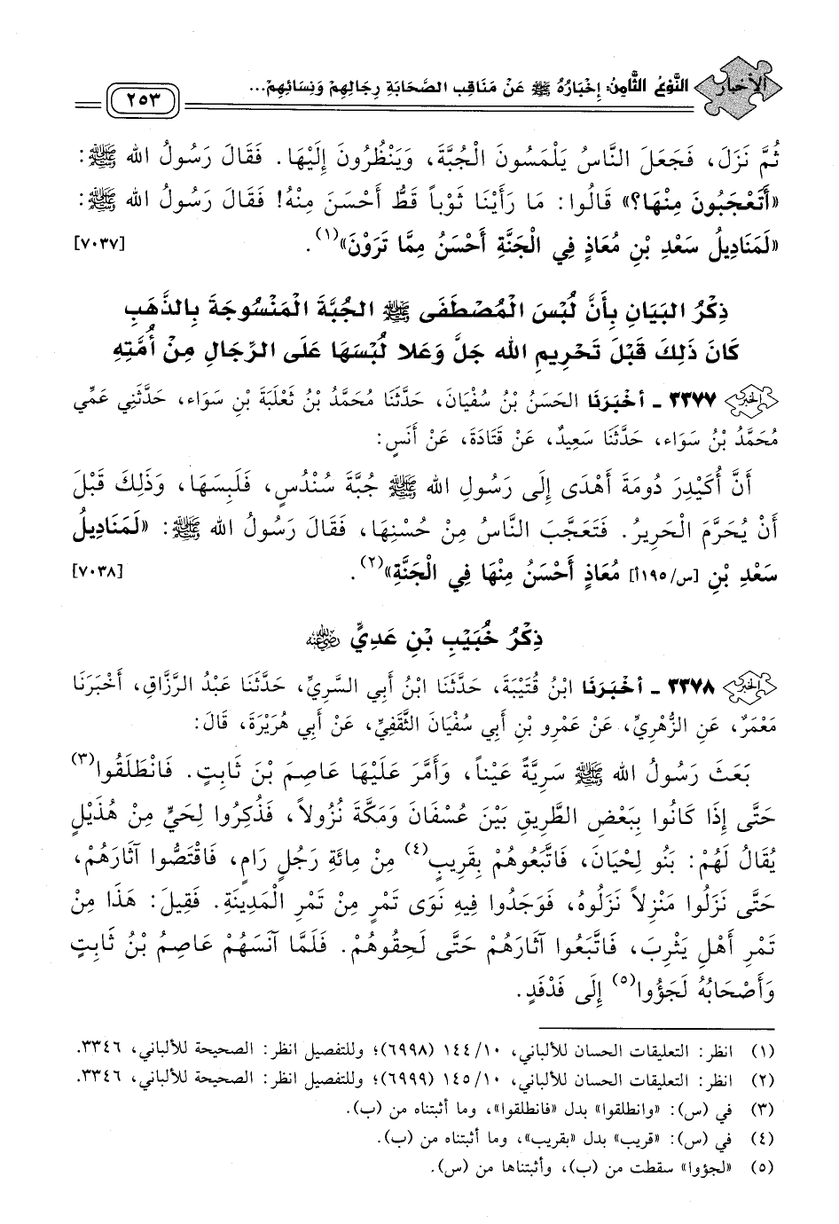 ٣٣٧٧ - أَخبَرنا الْحَسَنُ بْنُ سُفْيَانَ، حَدثنا مُحَمَّدُ بْنُ ثَعْلَبَةَ بْنِ سَوَاءٍ، حَدَّثَنِي عَمِّي مُحَمَّدُ بْنُ سَوَاءٍ، حَدثنا سَعِيدٌ، عَنْ قَتَادَةَ، عَنْ أَنَسٍ، أَنَّ أُكَيْدِرَ دُومَةَ أَهْدَى إِلَى رَسُولِ اللهِ صَلى الله عَلَيه وسَلم جُبَّةَ سُنْدُسٍ، فَلَبِسَهَا، وَذَلِكَ قَبْلَ أَنْ يُحَرَّمَ الْحَرِيرُ، فَتَعَجَّبَ النَّاسُ مِنْ حُسْنِهَا، فَقَالَ رَسُولُ اللهِ صَلى الله عَلَيه وسَلم: "لَمَنَادِيلُ سَعْدِ بْنِ مُعَاذٍ أَحْسَنُ مِنْهَا فِي الْجَنَّةِ". [٧٠٣٨]