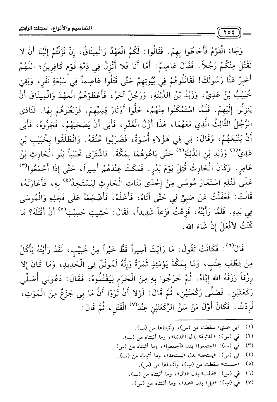 فَقَالَ عَاصِمٌ: أَمَّا أَنَا فَلَا أَنْزِلُ فِي ذِمَّةِ قَوْمٍ كَافِرِينَ، اللهُمَّ أَخْبِرْ عَنَّا رَسُولَكَ، فَقَاتَلُوهُمْ فِي بُيُوتِهِمْ حَتَّى قَتَلُوا عَاصِمًا فِي سَبْعَةِ نَفَرٍ، وَبَقِيَ خُبَيْبُ بْنُ عَدِيٍّ وَزَيْدُ بْنُ الدَّثِنَةِ، وَرَجُلٌ آخَرُ فَأَعْطَوْهُمُ الْعَهْدَ وَالْمِيثَاقَ أَنْ يَنْزِلُوا إِلَيْهِمْ، فَلَمَّا اسْتَمْكَنُوا مِنْهُمْ حَلُّوا أَوْتَارَ قِسِيِّهِمْ، فَرَبَطُوهُمْ بِهَا، فَنَادَى الرَّجُلُ الثَّالِثُ الَّذِي مَعَهُمَا، هَذَا أَوَّلُ الْغَدْرِ، فَأَبَى أَنْ يَصْحَبَهُمْ، فَجَرُّوهُ، فَأَبَى أَنْ يَتَّبِعَهُمْ، وَقَالَ: لِي فِي هَؤُلَاءِ أُسْوَةٌ، فَضَرَبُوا عُنُقَهُ، وَانْطَلَقُوا بِخُبَيْبِ بْنِ عَدِيٍّ وَزَيْدِ بْنِ الدَّثِنَةِ حَتَّى بَاعُوهُمَا بِمَكَّةَ فَاشْتَرَى خُبَيْبًا بَنُو الْحَارِثِ بْنُ عَامِرٍ، وَكَانَ الْحَارِثُ قُتِلَ يَوْمَ بَدْرٍ، فَمَكَثَ عِنْدَهُمْ أَسِيرًا، حَتَّى إِذَا أَجْمَعُوا عَلَى قَتْلِهِ اسْتَعَارَ مُوسَى مِنْ إِحْدَى بَنَاتِ الْحَارِثِ لِيَسْتَحِدَّ بِهِ، فَأَعَارَتْهُ، قَالَتْ: فَغَفَلْتُ عَنْ صَبِيٍّ لِي حَتَّى أَتَاهُ، فَأَخَذَهُ فَأَضْجَعَهُ عَلَى فَخِذِهِ، وَالْمُوسَى فِي يَدِهِ، فَلَمَّا رَأَيْتُهُ، فَزِعْتُ فَزَعًا شَدِيدًا،