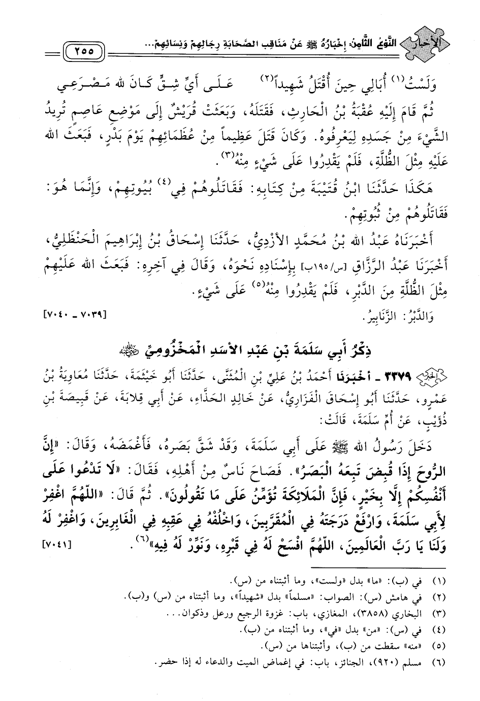 ٣٣٧٩ - أَخبَرنا أَحْمَدُ بْنُ عَلِيِّ بْنِ الْمُثَنَّى، حَدثنا أَبُو خَيْثَمَةَ، حَدثنا مُعَاوِيَةُ بْنُ عَمْرٍو، حَدثنا أَبُو إِسْحَاقَ الْفَزَارِيُّ، عَنْ خَالِدٍ الْحَذَّاءِ، عَنْ أَبِي قِلَابَةَ، عَنْ قَبِيصَةَ بْنِ ذُؤَيْبٍ، عَنْ أُمِّ سَلَمَةَ، قَالَتْ: دَخَلَ رَسُولُ اللهِ صَلى الله عَلَيه وسَلم عَلَى أَبِي سَلَمَةَ، وَقَدْ شَقَّ بَصَرُهُ فَأَغْمَضَهُ، وَقَالَ: "إِنَّ الرُّوحَ إِذَا قُبِضَ تَبِعَهُ الْبَصَرُ"، فَصَاحَ نَاسٌ مِنْ أَهْلِهِ، فَقَالَ: "لَا تَدْعُوا عَلَى أَنْفُسِكُمْ إِلَاّ بِخَيْرٍ، فَإِنَّ الْمَلَائِكَةَ تُؤَمِّنُ عَلَى مَا تَقُولُونَ"، ثُمَّ قَالَ: "اللهُمَّ اغْفِرْ لأَبِي سَلَمَةَ، وَارْفَعْ دَرَجَتَهُ فِي الْمُقَرَّبِينَ، وَاخْلُفْهُ فِي عَقِبِهِ فِي الْغَابِرِينَ، وَاغْفِرْ لَهُ وَلَنَا يَا رَبَّ الْعَالَمِينَ، اللهُمَّ افْسَحْ لَهُ فِي قَبْرِهِ، وَنَوِّرْ لَهُ فِيهِ". [٧٠٤١]