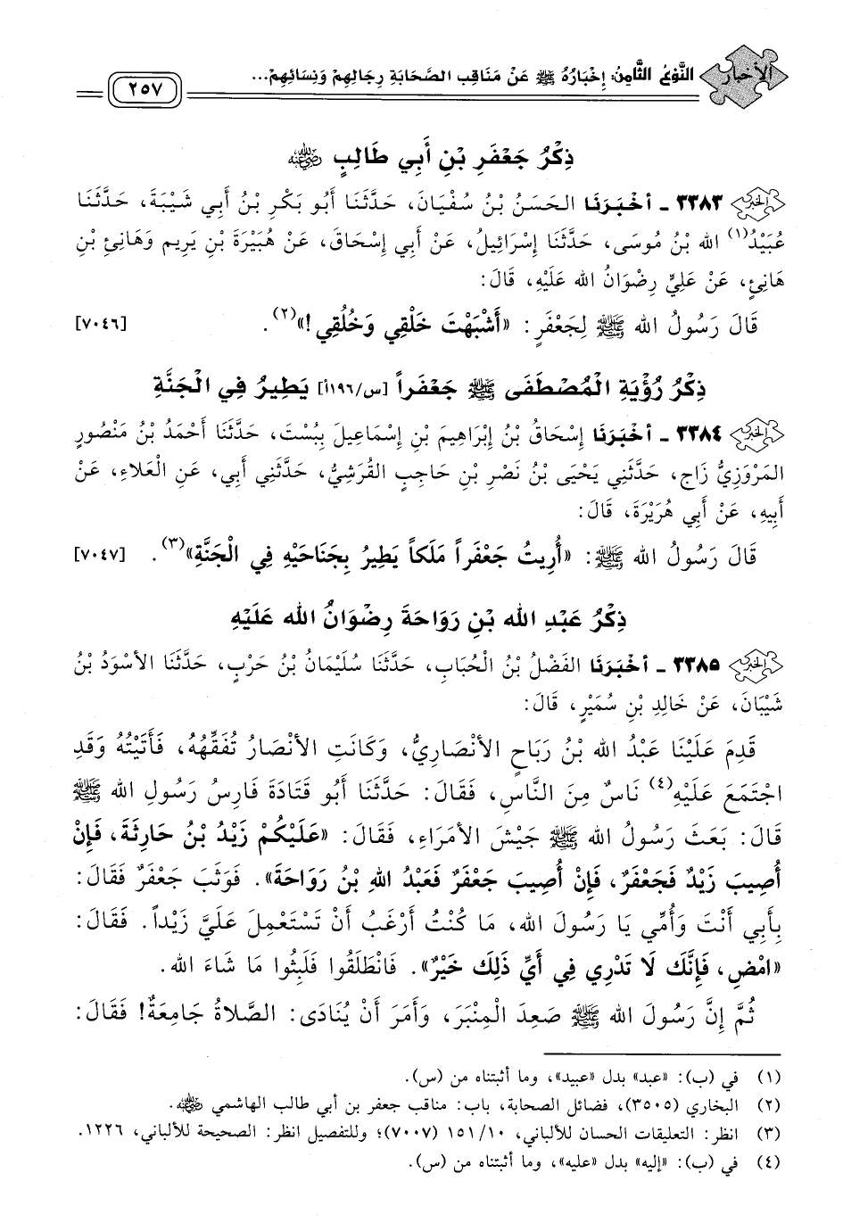 ذِكْرُ رُؤْيَةِ الْمُصْطَفَى صَلى الله عَلَيه وسَلم جَعْفَرًا يَطِيرُ فِي الْجَنَّةِ.