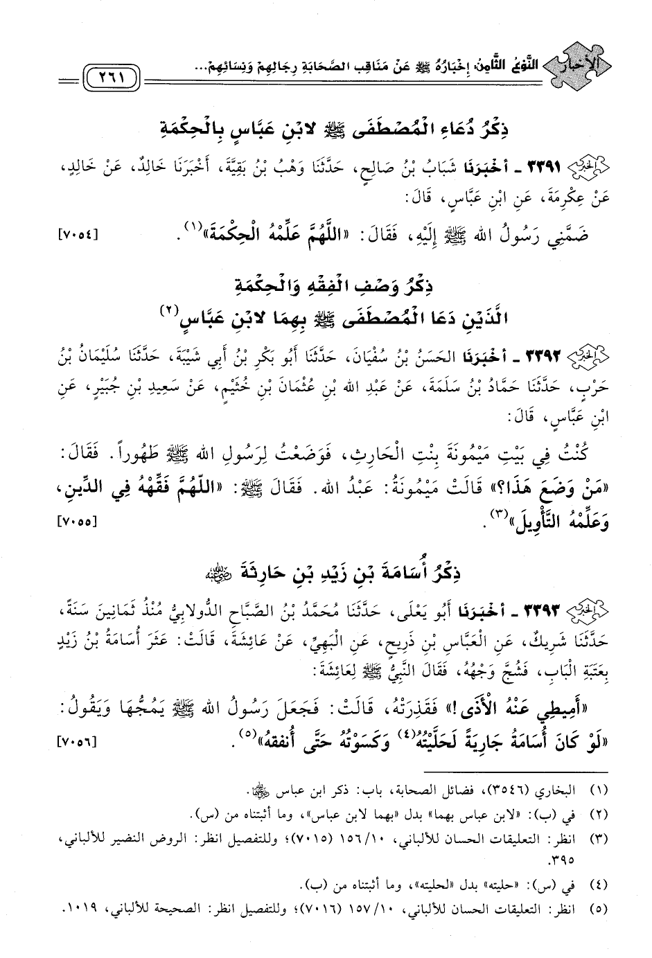 ٣٣٩١ - أَخبَرنا شَبَابُ بْنُ صَالِحٍ، حَدثنا وَهْبُ بْنُ بَقِيَّةَ، أَخبَرنا خَالِدٌ، عَنْ خَالِدٍ، عَنْ عِكْرِمَةَ، عَنِ ابْنِ عَبَّاسٍ، قَالَ: ضَمَّنِي رَسُولُ اللهِ صَلى الله عَلَيه وسَلم إِلَيْهِ، فَقَالَ: "اللهُمَّ عَلِّمْهُ الْحِكْمَةَ". [٧٠٥٤]