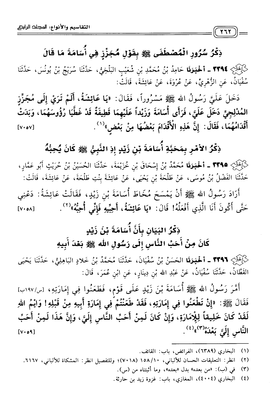 ذِكْرُ سُرُورِ الْمُصْطَفَى صَلى الله عَلَيه وسَلم بِقَوْلِ مُجَزِّزٍ فِي أُسَامَةَ مَا قَالَ.
