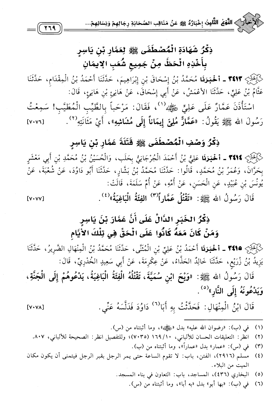 ٣٤١٣ - أَخبَرنا مُحَمَّدُ بْنُ إِسْحَاقَ بْنِ إِبْرَاهِيمَ، حَدثنا أَحْمَدُ بْنُ الْمِقْدَامِ، حَدثنا عَثَّامُ بْنُ عَلِيٍّ، حَدثنا الأَعْمَشُ، عَنْ أَبِي إِسْحَاقَ، عَنْ هَانِئِ بْنِ هَانِئٍ، قَالَ: اسْتَأْذَنَ عَمَّارٌ عَلَى عَلِيٍّ رَضِيَ اللهُ عَنْهُ، فَقَالَ: مَرْحَبًا بِالطَّيِّبِ الْمُطَيَّبِ، سَمِعْتُ رَسُولَ اللهِ صَلى الله عَلَيه وسَلم، يَقُولُ: "عَمَّارٌ مُلِئَ إِيمَانًا إِلَى مُشَاشِهِ" أَيْ مَثَانَتِهِ. [٧٠٧٦]