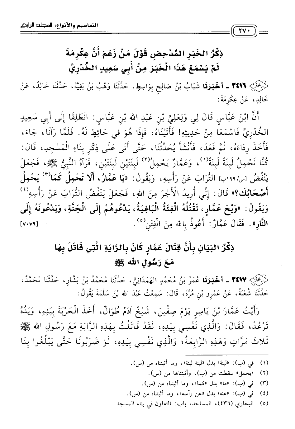 ٣٤١٦ - أَخبَرنا شَبَابُ بْنُ صَالِحٍ بِوَاسِطَ، حَدثنا وَهْبُ بْنُ بَقِيَّةَ، حَدثنا خَالِدٌ، عَنْ خَالِدٍ، عَنْ عِكْرِمَةَ، أَنَّ ابْنَ عَبَّاسٍ قَالَ لِي وَلِعَلِيِّ بْنِ عَبْدِ اللهِ بْنِ عَبَّاسٍ: انْطَلِقَا إِلَى أَبِي سَعِيدٍ الْخُدْرِيِّ، فَاسْمَعَا مِنْ حَدِيثِهِ، فَأَتَيْنَاهُ، فَإِذَا هُوَ فِي حَائِطٍ لَهُ، فَلَمَّا رَآنَا جَاءَ، فَأَخَذَ رِدَاءَهُ، ثُمَّ قَعَدَ فَأَنْشَأَ يُحَدِّثُنَا حَتَّى أَتَى عَلَى ذِكْرِ بِنَاءِ الْمَسْجِدِ، قَالَ: كُنَّا نَحْمِلُ لَبِنَةً لَبِنَةً وَعَمَّارٌ يحمل لَبِنَتَيْنِ لَبِنَتَيْنِ، فَرَآهُ النَّبِيُّ صَلى الله عَلَيه وسَلم، فَجَعَلَ يَنْفُضُ التُّرَابَ عَنْ رَأْسِهِ وَيَقُولُ: "يَا عَمَّارُ، أَلَا تَحْمِلُ كَمَا يَحْمِلُ أَصْحَابُكَ؟ " قَالَ: إِنِّي أُرِيدُ الأَجْرَ مِنَ اللهِ، فَجَعَلَ يَنْفُضُ التُّرَابَ عَنْ رَأْسِهِ وَيَقُولُ: "وَيْحُ عَمَّارٍ، تَقْتُلُهُ الْفِئَةُ الْبَاغِيَةُ، يَدْعُوهُمْ إِلَى الْجَنَّةِ، وَيَدْعُونَهُ إِلَى النَّارِ". فَقَالَ عَمَّارٌ: أَعُوذُ بِاللهِ مِنَ الْفِتَنِ. [٧٠٧٩]