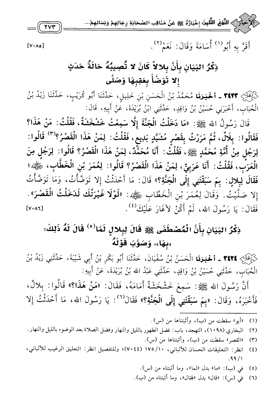 ٣٤٢٤ - أَخبَرنا الْحَسَنُ بْنُ سُفْيَانَ، حَدثنا أَبُو بَكْرِ بْنُ أَبِي شَيْبَةَ، حَدَّثَنِي زَيْدُ بْنُ الْحُبَابِ، حَدَّثَنِي حُسَيْنُ بْنُ وَاقِدٍ، حَدَّثَنِي عَبْدُ اللهِ بْنُ بُرَيْدَةَ، عَنْ أبيه، أَنّ رَسُولَ اللهِ صلى الله عليه وسلم سَمِعَ خَشْخَشَةً أَمَامَهُ، فَقَالَ: "مَنْ هَذَا؟ " قَالُوا: بِلالٌ، فَأَخْبَرَهُ، وَقَالَ: "بِمَ سَبَقْتَنِي إِلَى الْجَنَّةِ"، فَقَالَ: يَا رَسُولَ اللهِ، مَا أَحْدَثْتُ إِلا تَوَضَّأْتُ، وَلَا تَوَضَّأْتُ إِلا رَأَيْتُ أَنَّ للهِ عَلَيَّ رَكْعَتَيْنِ أُصَلِّيهِمَا، قَالَ صلى الله عليه وسلم: "بِهَا". [٧٠٨٧]