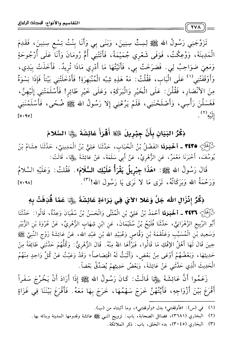 ٣٤٣٦ - أَخبَرنا أَحْمَدُ بْنُ عَلِيِّ بْنِ الْمُثَنَّى، وَالْحَسَنُ بْنُ سُفْيَانَ، وَعِدَّةٌ، قَالُوا: حَدثنا أَبُو الرَّبِيعِ الزَّهْرَانِيُّ، حَدثنا فُلَيْحُ بْنُ سُلَيْمَانَ، عَنِ ابْنِ شِهَابٍ الزُّهْرِيُّ، عَنْ عُرْوَةَ بْنِ الزُّبَيْرِ، وَسَعِيدِ بْنِ الْمُسَيَّبِ، وَعَلْقَمَةَ بْنِ وَقَّاصٍ، وَعُبَيْدِ اللهِ بْنِ عَبْدِ اللهِ، عَنْ عَائِشَةَ زَوْجِ النَّبِيِّ صَلى الله عَلَيه وسَلم حِينَ قَالَ لَهَا أَهْلُ الإِفْكِ مَا قَالُوا، فَبَرَّأَهَا اللهُ مِنْهُ، قَالَ الزُّهْرِيُّ: وَكُلُّهُمْ حَدَّثَنِي طَائِفَةً مِنْ حَدِيثِهَا وَبَعْضُهُمْ أَوْعَى مِنْ بَعْضٍ، وَأَثْبَتُّ لَهُ اقْتِصَاصًا، وَقَدْ وَعَيْتُ عَنْ كُلِّ وَاحِدٍ مِنْهُمُ الْحَدِيثَ الَّذِي حَدَّثَنِي عَنْ عَائِشَةَ، وَبَعْضُ حَدِيثِهِمْ يُصَدِّقُ بَعْضًا.