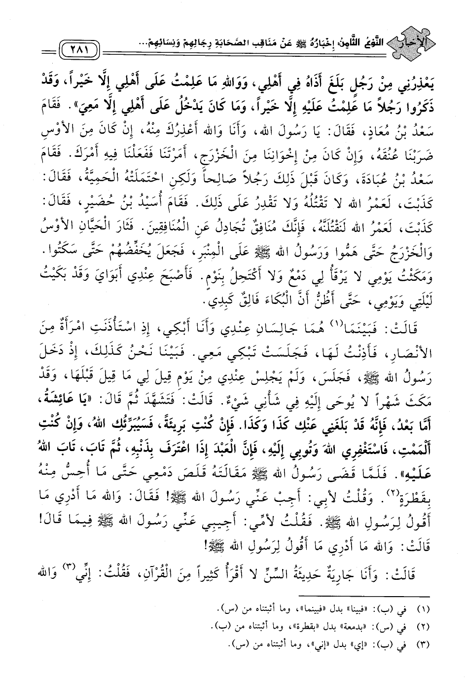 فَقَامَ رَسُولُ اللهِ صَلى الله عَلَيه وسَلم مِنْ يَوْمِهِ، فَاسْتَعْذَرَ مِنْ عَبْدِ اللهِ بْنِ أُبَيِّ ابْنِ سَلُولٍ، فَقَالَ: "مَنْ يَعْذِرُنِي مِنْ رَجُلٍ بَلَغَ أَذَاهُ فِي أَهْلِي، وَوَاللهِ مَا عَلِمْتُ عَلَى أَهْلِي إِلَاّ خَيْرًا وَقَدْ ذَكَرُوا رَجُلاً مَا عَلِمْتُ عَلَيْهِ إِلَاّ خَيْرًا، وَمَا كَانَ يَدْخُلُ عَلَى أَهْلِي إِلَاّ مَعِي"، فَقَامَ سَعْدُ بْنُ مُعَاذٍ، فَقَالَ: يَا رَسُولَ اللهِ، وَأَنَا وَاللهِ أَعْذِرُكَ مِنْهُ إِنْ كَانَ مِنَ الأَوْسِ ضَرَبْنَا عُنُقَهُ، وَإِنْ كَانَ مِنْ إِخْوَانِنَا مِنَ الْخَزْرَجِ أَمَرْتَنَا، فَفَعَلْنَا فِيهِ أَمْرَكَ، فَقَامَ سَعْدُ بْنُ عُبَادَةَ، وَكَانَ قَبْلَ ذَلِكَ رَجُلاً صَالِحًا، وَلَكِنِ احْتَمَلَتْهُ الْحَمِيَّةُ، فَقَالَ: كَذَبْتَ لَعَمْرُ اللهِ لَا تَقْتُلُهُ، وَلَا تَقْدِرُ عَلَى ذَلِكَ، فَقَامَ أُسَيْدُ بْنُ حُضَيْرٍ، فَقَالَ: كَذَبْتَ، لَعَمْرُ اللهِ لَنَقْتُلَنَّهُ، فَإِنَّكَ مُنَافِقٌ تُجَادِلُ عَنِ الْمُنَافِقِينَ، فَثَارَ الْحَيَّانِ الأَوْسُ وَالْخَزْرَجُ حَتَّى هَمُّوا وَرَسُولُ اللهِ صَلى الله عَلَيه وسَلم عَلَى الْمِنْبَرِ، فَجَعَلَ يُخَفِّضُهُمْ حَتَّى سَكَتُوا، وَمَكَثْتُ يَوْمِي لَا يَرْقَأُ لِي دَمْعٌ، وَلَا أَكْتَحِلُ بِنَوْمٍ،