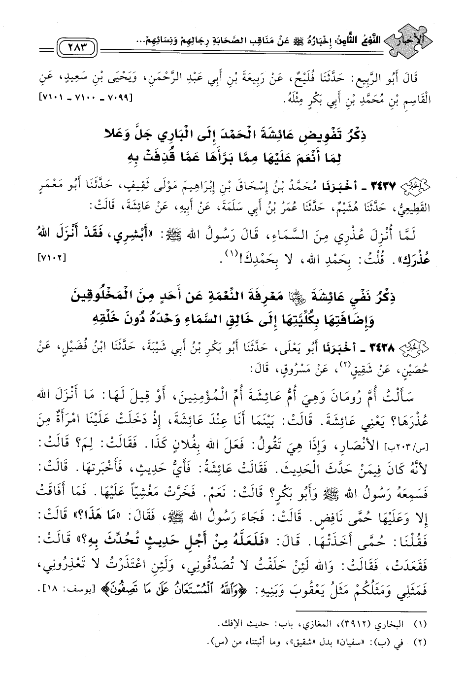 ٣٤٣٨ - أَخبَرنا أَبُو يَعْلَى، حَدثنا أَبُو بَكْرِ بْنُ أَبِي شَيْبَةَ، حَدثنا ابْنُ فُضَيْلٍ، عَنْ حُصَيْنٍ، عَنْ شَقِيقٍ، عَنْ مَسْرُوقٍ، قَالَ: سَأَلْتُ أُمَّ رُومَانَ وَهِيَ أُمُّ عَائِشَةَ أُمِّ الْمُؤْمِنِينَ، أَوْ قِيلَ لَهَا: مَا أَنْزَلَ اللهُ عُذْرَهَا؟ يَعْنِي عَائِشَةَ، قَالَتْ: بَيْنَمَا أَنَا عِنْدَ عَائِشَةَ إِذْ دَخَلَتْ عَلَيْنَا امْرَأَةٌ مِنَ الأَنْصَارِ وَإِذَا هِيَ تَقُولُ: فَعَلَ اللهُ بِفُلَانٍ كَذَا، فَقَالَتْ: لِمَ؟ قَالَتْ: لأَنَّهُ كَانَ فِيمَنْ حَدَّثَ الْحَدِيثَ، فَقَالَتْ عَائِشَةُ: فَأَيُّ حَدِيثٍ؟ فَأَخْبَرْتُهَا، قَالَتْ: فَسَمِعَهُ رَسُولُ اللهِ صَلى الله عَلَيه وسَلم، وَأَبُو بَكْرٍ؟ قَالَتْ: نَعَمْ، فَخَرَّتْ مَغْشِيًّا عَلَيْهَا، فَمَا أَفَاقَتْ إِلَاّ وَعَلَيْهَا حُمَّى نَافِضٌ، قَالَتْ: فَجَاءَ رَسُولُ اللهِ صَلى الله عَلَيه وسَلم، فَقَالَ: "مَا هَذَا؟ " قَالَتْ: فَقُلْنَا: حُمَّى أَخَذَتْهَا، قَالَ: "فَلَعَلَّهُ مِنْ أَجْلِ حَدِيثٍ تُحُدِّثَ بِهِ"، قَالَتْ: فَقَعَدَتْ، فَقَالَتْ: وَاللهِ لَئِنْ حَلَفْتُ لَا تُصَدِّقُونِي وَلَئِنِ اعْتَذَرْتُ لَا تَعْذِرُونِي، فَمَثَلِي وَمَثَلُكُمْ مِثْلُ يَعْقُوبَ وَبَنِيهِ: {وَاللهُ الْمُسْتَعَانُ عَلَى مَا تَصِفُونَ} [يوسف: ١٨]، قَالَتْ: فَأَنْزَلَ اللهُ عَلَيْهِ مَا أَنْزَلَ فَأَخْبَرَهَا، فَقَالَتْ: بِحَمْدِ اللهِ لَا بِحَمْدِ أَحَدٍ. [٧١٠٣]