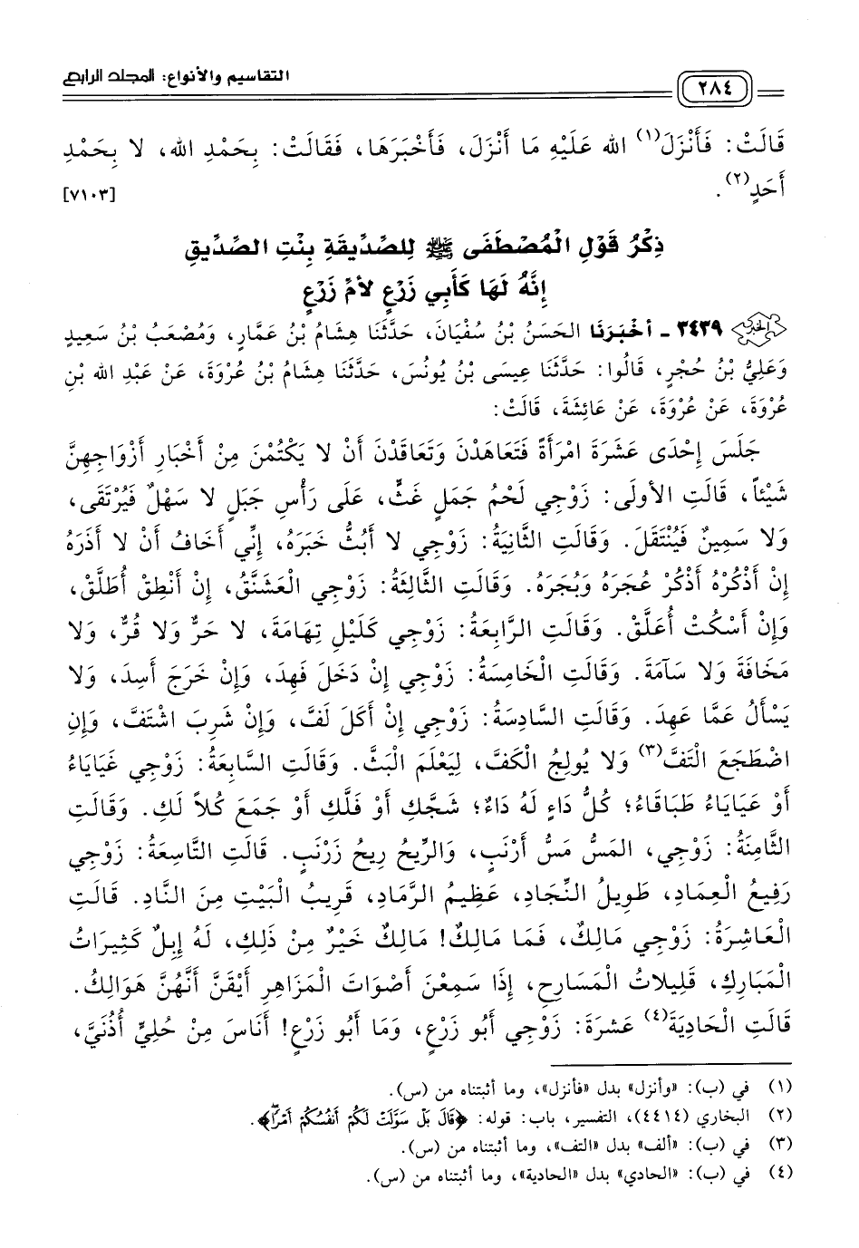 ٣٤٣٩ - أَخبَرنا الْحَسَنُ بْنُ سُفْيَانَ، حَدثنا هِشَامُ بْنُ عَمَّارٍ، وَمُصْعَبُ بْنُ سَعِيدٍ، وَعَلِيُّ بْنُ حُجْرٍ، قَالُوا: حَدثنا عِيسَى بْنُ يُونُسَ، حَدثنا هِشَامُ بْنُ عُرْوَةَ، عَنْ عَبْدِ اللهِ بْنِ عُرْوَةَ، عَنْ عُرْوَةَ، عَنْ عَائِشَةَ، قَالَتْ: جَلَسَ إِحْدَى عَشْرَةَ امْرَأَةً، فَتَعَاهَدْنَ وَتَعَاقَدْنَ أَنْ لَا يَكْتُمْنَ مِنْ أَخْبَارِ أَزْوَاجِهِنَّ شَيْئًا.