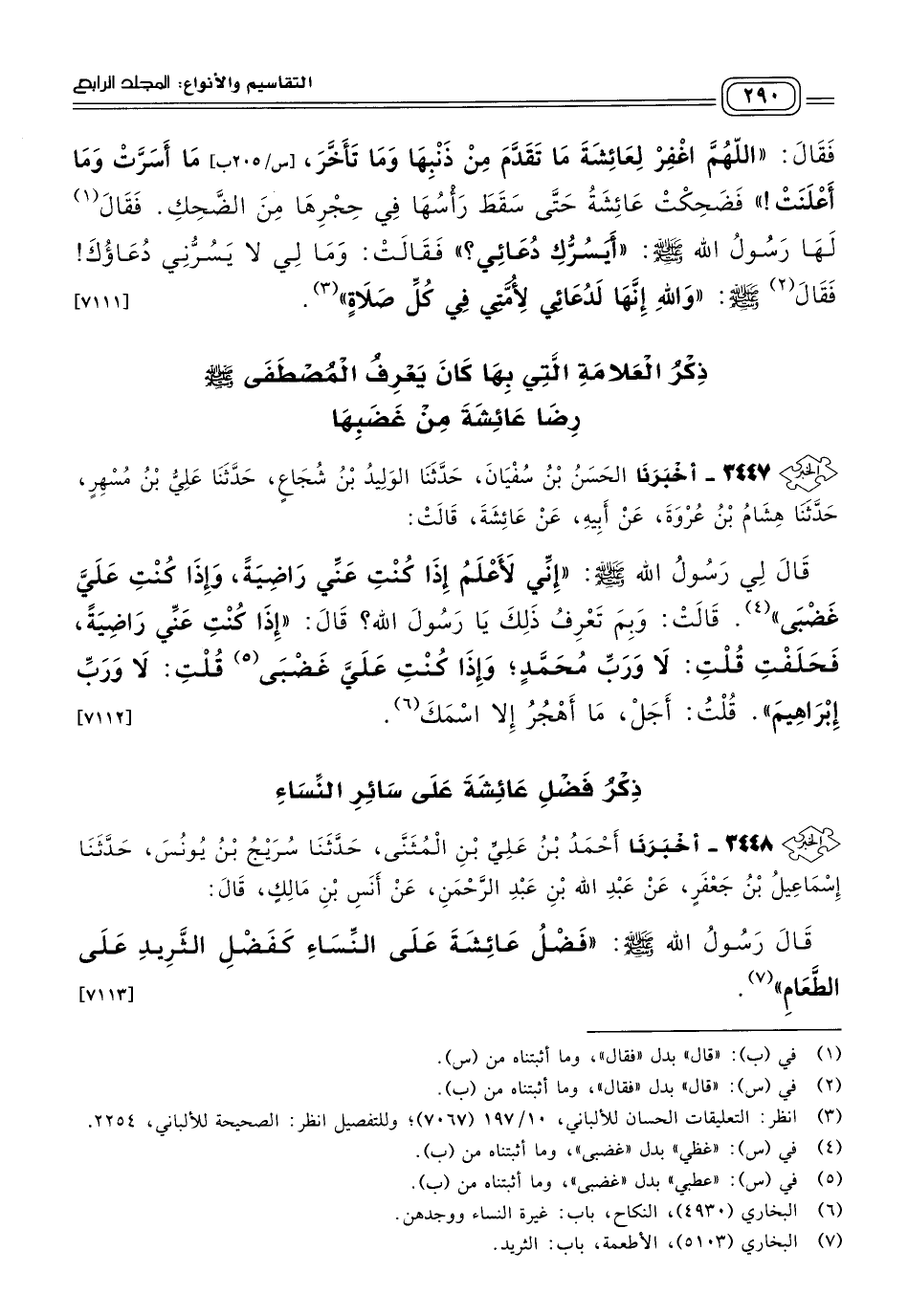٣٤٤٨ - أَخبَرنا أَحْمَدُ بْنُ عَلِيِّ بْنِ الْمُثَنَّى، حَدثنا سُرَيْجُ بْنُ يُونُسَ، حَدثنا إِسْمَاعِيلُ بْنُ جَعْفَرٍ، عَنْ عَبْدِ اللهِ بْنِ عَبْدِ الرَّحْمَنِ، عَنْ أَنَسِ بْنِ مَالِكٍ، قَالَ: قَالَ رَسُولُ اللهِ صَلى الله عَلَيه وسَلم: "فَضْلُ عَائِشَةَ عَلَى النِّسَاءِ كَفَضْلِ الثَّرِيدِ عَلَى الطَّعَامِ". [٧١١٣]