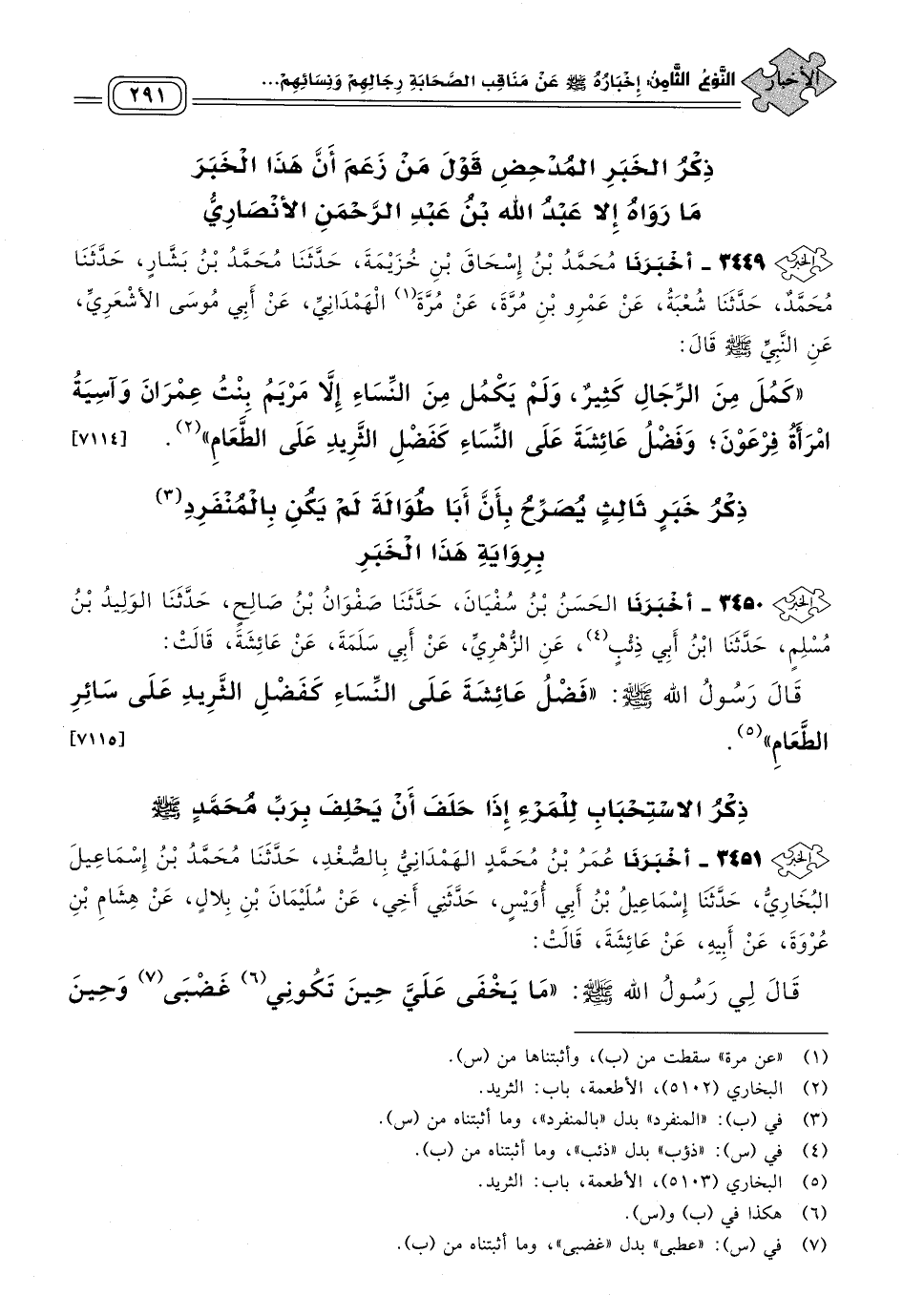 ٣٤٤٩ - أَخبَرنا مُحَمَّدُ بْنُ إِسْحَاقَ بْنِ خُزَيْمَةَ، حَدثنا مُحَمَّدُ بْنُ بَشَّارٍ، حَدثنا مُحَمَّدٌ، حَدثنا شُعْبَةُ، عَنْ عَمْرِو بْنِ مُرَّةَ، عَنْ مُرَّةَ الْهَمْدَانِيِّ، عَنْ أَبِي مُوسَى الأَشْعَرِيِّ، عَنِ النَّبِيِّ صَلى الله عَلَيه وسَلم، قَالَ: "كَمُلَ مِنَ الرِّجَالِ كَثِيرٌ، وَلَمْ يَكْمُلْ مِنَ النِّسَاءِ إِلَاّ مَرْيَمُ بِنْتُ عِمْرَانَ، وَآسِيَةُ امْرَأَةُ فِرْعَوْنَ، وَفَضْلُ عَائِشَةَ عَلَى النِّسَاءِ كَفَضْلِ الثَّرِيدِ عَلَى الطَّعَامِ". [٧١١٤]
