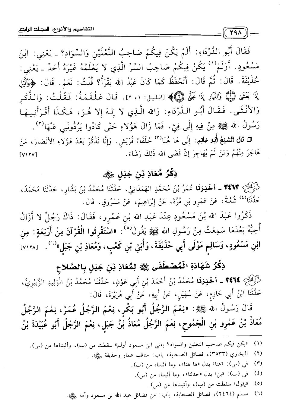 ٣٤٦٣ - أَخبَرنا عُمَرُ بْنُ مُحَمَّدٍ الْهَمْدَانِيُّ، حَدثنا مُحَمَّدُ بْنُ بَشَّارٍ، حَدثنا مُحَمَّدٌ، حَدثنا شُعْبَةُ، عَنْ عَمْرِو بْنِ مُرَّةَ، عَنْ إِبْرَاهِيمَ، عَنْ مَسْرُوقٍ، قَالَ: ذَكَرُوا عَبْدَ اللهِ بْنَ مَسْعُودٍ عِنْدَ عَبْدِ اللهِ بْنِ عَمْرٍو، فَقَالَ: ذَاكَ رَجُلٌ لَا أَزَالُ أُحِبُّهُ بَعْدَ مَا سَمِعْتُ مِنْ رَسُولِ اللهِ صَلى الله عَلَيه وسَلم يَقُولُ: "اسْتَقْرِئُوا الْقُرْآنَ مِنْ أَرْبَعَةٍ: مِنِ ابْنِ مَسْعُودٍ، وَسَالِمٍ مَوْلَى أَبِي حُذَيْفَةَ، وَأُبَيِّ بْنِ كَعْبٍ، وَمُعَاذِ بْنِ جَبَلٍ". [٧١٢٨]
