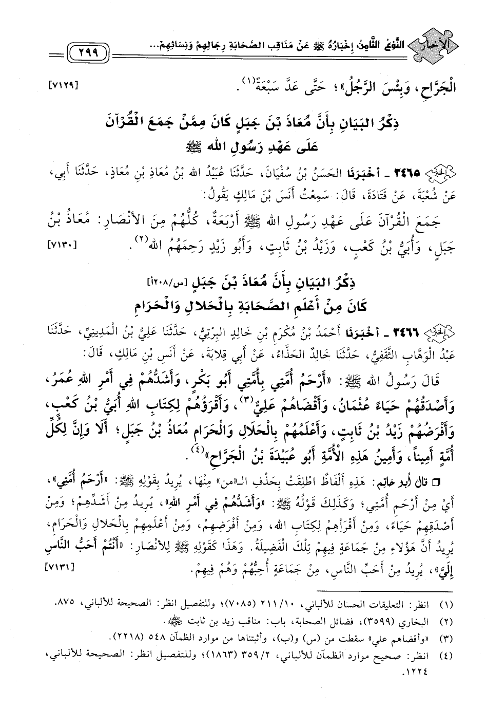 قَالَ أَبُو حَاتِمٍ: هَذِهِ أَلْفَاظٌ أُطْلِقَتْ بِحَذْفِ الـ"مِنْ" مِنْهَا، يُرِيدُ بِقَوْلِهِ صَلى الله عَلَيه وسَلم: "أَرْحَمُ أَمَّتِي" أَيْ مِنْ أَرْحَمِ أُمَّتِي، وَكَذَلِكَ قَوْلُهُ صَلى الله عَلَيه وسَلم: "وَأَشَدُّهُمْ فِي أَمْرِ اللهِ" يُرِيدُ مِنْ أَشَدِّهِمْ، وَمِنْ أَصْدَقِهِمْ حَيَاءً، وَمِنْ أَقْرئِهِمْ لِكِتَابِ اللهِ، وَمِنْ أَفْرَضِهِمْ، وَمِنْ أَعْلَمِهِمْ بِالْحَلَالِ وَالْحَرَامِ، يُرِيدُ أَنَّ هَؤُلَاءِ مِنْ جَمَاعَةٍ فِيهِمْ تِلْكَ الْفَضِيلَةُ. وَهَذَا كَقَوْلِهِ صَلى الله عَلَيه وسَلم لِلأَنْصَارِ: "أَنْتُمْ أَحَبُّ النَّاسِ إِلَيَّ" يُرِيدُ مِنْ أَحَبِّ النَّاسِ مِنْ جَمَاعَةٍ أُحِبُّهُمْ وَهُمْ فِيهِمْ. [٧١٣١]