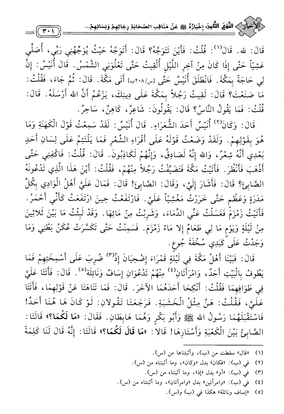 قال: قُلْتُ: فَأَيْنَ تَتَوَجَّهُ؟ قَالَ: أَتَوَجَّهُ حَيْثُ يُوَجِّهُنِي رَبِّي أُصَلِّي عَشِيًّا حَتَّى إِذَا كَانَ مِنْ آخِرِ اللَّيْلِ أُلْقِيتُ حَتَّى تَعْلُوَنِي الشَّمْسُ، قَالَ أُنَيْسٌ: إِنَّ لِيَ حَاجَةً بِمَكَّةَ، فَانْطَلَقَ أُنَيْسٌ حَتَّى أَتَى مَكَّةَ، قَالَ: ثُمَّ جَاءَ، فَقُلْتُ: مَا صَنَعْتَ؟ قَالَ: لَقِيتُ رَجُلاً بِمَكَّةَ عَلَى دِينِكَ يَزْعُمُ أَنَّ اللهَ أَرْسَلَهُ، قَالَ: قُلْتُ: فَمَا يَقُولُ النَّاسُ؟ قَالَ: يَقُولُونَ: شَاعِرٌ كَاهِنٌ سَاحِرٌ.