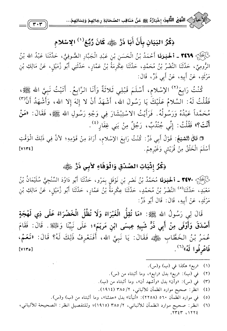 قَالَ الشَّيْخُ: قَوْلُ أَبِي ذَرٍّ: كُنْتُ رَابِعَ الإِسْلَامِ، أَرَادَ مِنْ قَوْمِهِ لأَنَّ فِي ذَلِكَ الْوَقْتِ أَسْلَمَ الْخَلْقُ مِنْ قُرَيْشٍ وَغَيْرِهِمْ. [٧١٣٤]