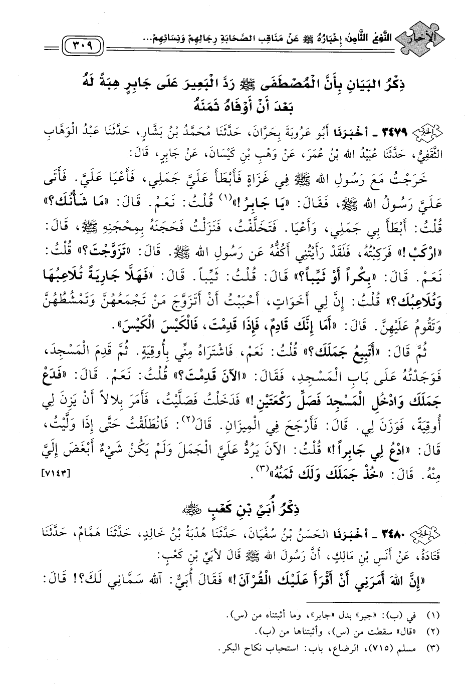 ذِكْرُ الْبَيَانِ بِأَنَّ الْمُصْطَفَى صَلى الله عَلَيه وسَلم رَدَّ الْبَعِيرَ عَلَى جَابِرٍ هِبَةً لَهُ بَعْدَ أَنْ أَوْفَاهُ ثَمَنَهُ.