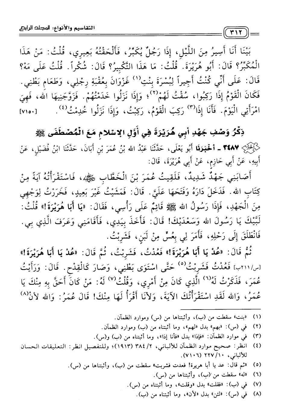 ٣٤٨٧ - أَخبَرنا أَبُو يَعْلَى، حَدثنا عَبْدُ اللهِ بْنُ عُمَرَ بْنِ أَبَانَ، حَدثنا ابْنُ فُضَيْلٍ، عَنْ أَبِيهِ، عَنْ أَبِي حَازِمٍ، عَنْ أَبِي هُرَيْرَةَ، قَالَ: أَصَابَنِي جَهْدٌ شَدِيدٌ، فَلَقِيتُ عُمَرَ بْنَ الْخَطَّابِ رَضِيَ اللهُ عَنْهُ، فَاسْتَقْرَأْتُهُ آيَةً مِنْ كِتَابِ اللهِ، فَدَخَلَ دَارَهُ وَفَتَحَهَا عَلَيَّ، قَالَ: فَمَشَيْتُ غَيْرَ بَعِيدٍ، فَخَرَرْتُ لِوَجْهِي مِنَ الْجَهْدِ، فَإِذَا رَسُولُ اللهِ صَلى الله عَلَيه وسَلم قَائِمٌ عَلَى رَأْسِي، فَقَالَ: "يَا أَبَا هُرَيْرَةَ"، قُلْتُ: لَبَّيْكَ يَا رَسُولَ اللهِ وَسَعْدَيْكَ، قَالَ: فَأَخَذَ بِيَدِي فَأَقَامَنِي وَعَرَفَ الَّذِي بِي، فَانْطَلَقَ إِلَى رَحْلِهِ، فَأَمَرَ لِي بِعُسٍّ مِنْ لَبَنٍ، فَشَرِبْتُ.