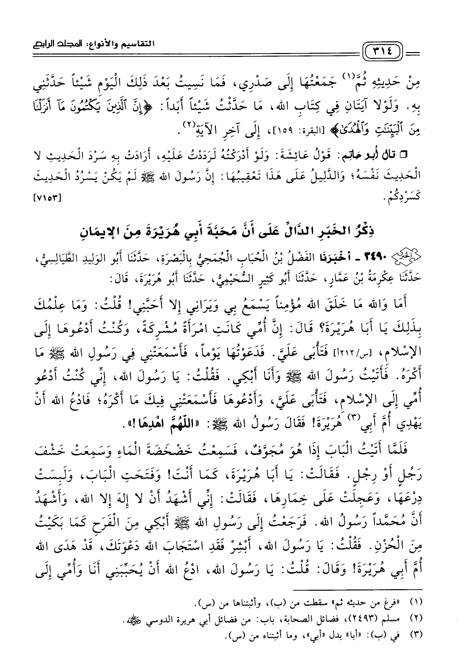 فَلَمَّا أَتَيْتُ الْبَابَ إِذَا هُوَ مُجَوَّفٌ، فَسَمِعْتُ خَضْخَضَةَ الْمَاءِ، وَسَمِعْتْ خَشْفَ رَجُلٍ أَوْ رِجْلٍ، فَقَالَتْ: يَا أَبَا هُرَيْرَةَ، كَمَا أَنْتَ، وَفَتَحَتِ الْبَابَ وَلَبِسَتْ دِرْعَهَا وَعَجِلَتْ عَلَى خِمَارِهَا، فَقَالَتْ: إِنِّي أَشْهَدُ أَنْ لَا إِلَهَ إِلَاّ اللهُ، وَأَشْهَدُ أَنَّ مُحَمَّدًا رَسُولُ اللهِ، فَرَجَعْتُ إِلَى رَسُولِ اللهِ صَلى الله عَلَيه وسَلم أَبْكِي مِنَ الْفَرَحِ كَمَا بَكَيْتُ مِنَ الْحُزْنِ، فَقُلْتُ: يَا رَسُولَ اللهِ، أَبْشِرْ فَقَدِ اسْتَجَابَ اللهُ دَعَوْتَكَ، قَدْ هَدَى اللهُ أُمَّ أَبِي هُرَيْرَةَ، وَقَالَ: قُلْتُ: يَا رَسُولَ اللهِ، ادْعُ اللهَ أَنْ يُحَبِّبَنِي أَنَا وَأُمِّي إِلَى عِبَادِهِ الْمُؤْمِنِينَ وَيُحَبِّبَهُمْ إِلَيَّ، قَالَ: فَقَالَ رَسُولُ اللهِ صَلى الله عَلَيه وسَلم: "اللهُمَّ حَبِّبْ عُبَيْدَكَ وَأُمَّهُ إِلَى عِبَادِكَ الْمُؤْمِنِينَ، وَحَبِّبْهُمْ إِلَيْهِمَا".