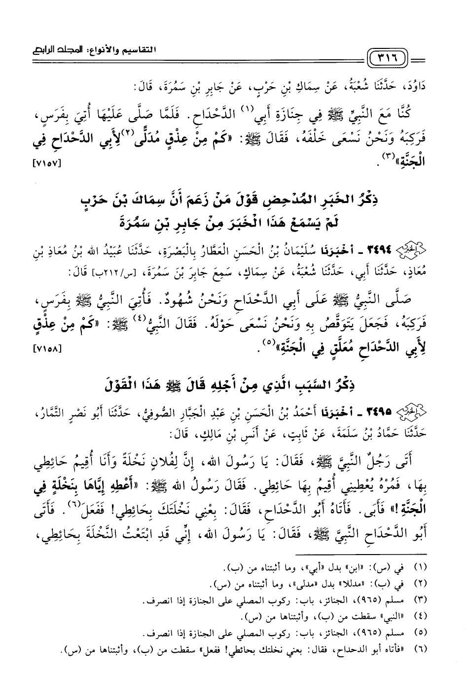 ٣٤٩٤ - أَخبَرنا سُلَيْمَانُ بْنُ الْحَسَنِ الْعَطَّارُ، بِالْبَصْرَةِ، حَدثنا عُبَيْدُ اللهِ بْنُ مُعَاذِ بْنِ مُعَاذٍ، حَدثنا أَبِي، حَدثنا شُعْبَةُ، عَنْ سِمَاكٍ، سَمِعَ جَابِرَ بْنَ سَمُرَةَ، قَالَ: صَلَّى النَّبِيُّ صَلى الله عَلَيه وسَلم عَلَى أَبِي الدَّحْدَاحِ وَنَحْنُ شُهُودٌ، فَأُتِيَ النَّبِيُّ صَلى الله عَلَيه وسَلم بِفَرَسٍ فَرَكِبَهُ، فَجَعَلَ يَتَوَقَّصُ بِهِ وَنَحْنُ نَسْعَى حَوْلَهُ، فَقَالَ النبي صَلى الله عَلَيه وسَلم: "كَمْ مِنْ عِذْقٍ لأَبِي الدَّحْدَاحِ مُعَلَّقٍ فِي الْجَنَّةِ". [٧١٥٨]