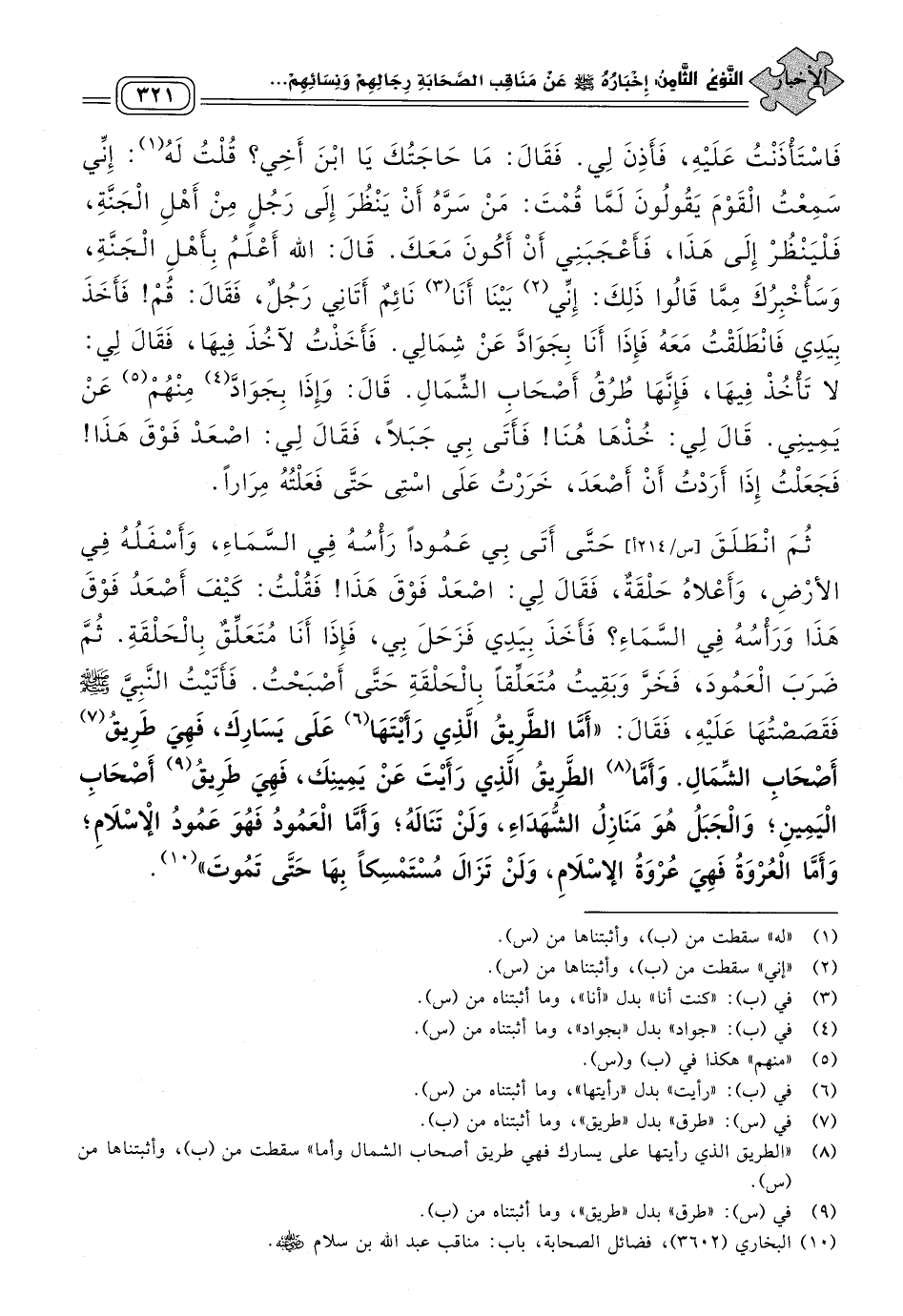 ثُمَّ انْطَلَقَ حَتَّى أَتَى بِي عَمُودًا رَأْسُهُ فِي السَّمَاءِ وَأَسْفَلُهُ فِي الأَرْضِ وَأَعْلَاهُ حَلْقَةٌ، فَقَالَ لِي: اصْعَدْ فَوْقَ هَذَا، فَقُلْتُ: كَيْفَ أَصْعَدُ فَوْقَ هَذَا وَرَأْسُهُ فِي السَّمَاءِ؟ فَأَخَذَ بِيَدِي فَزَحَلَ بِي، فَإِذَا أَنَا مُتَعَلِّقٌ بِالْحَلْقَةِ، ثُمَّ ضَرَبَ الْعَمُودَ فَخَرَّ وَبَقِيتُ مُتَعَلِّقًا بِالْحَلْقَةِ حَتَّى أَصْبَحْتُ، فَأَتَيْتُ النَّبِيَّ صَلى الله عَلَيه وسَلم فَقَصَصْتُهَا عَلَيْهِ، فَقَالَ: "أَمَّا الطَّرِيقُ الَّذِي رَأَيْتَهَا عَلَى يَسَارِكَ فَهِيَ طَرِيقُ أَصْحَابِ الشِّمَالِ، وَأَمَّا الطَّرِيقُ الَّذِي رَأَيْتَ عَنْ يَمِينِكَ فَهِيَ طَرِيقُ أَصْحَابِ الْيَمِينِ، وَالْجَبَلُ هُوَ مَنَازِلُ الشُّهَدَاءِ وَلَنْ تَنَالَهُ، وَأَمَّا الْعَمُودُ فَهُوَ عَمُودُ الإِسْلَامِ، وَأَمَّا الْعُرْوَةُ فَهِيَ عُرْوَةُ الإِسْلَامِ، وَلَنْ تَزَالَ مُسْتَمْسِكًا بِهَا حَتَّى تَمُوتَ".