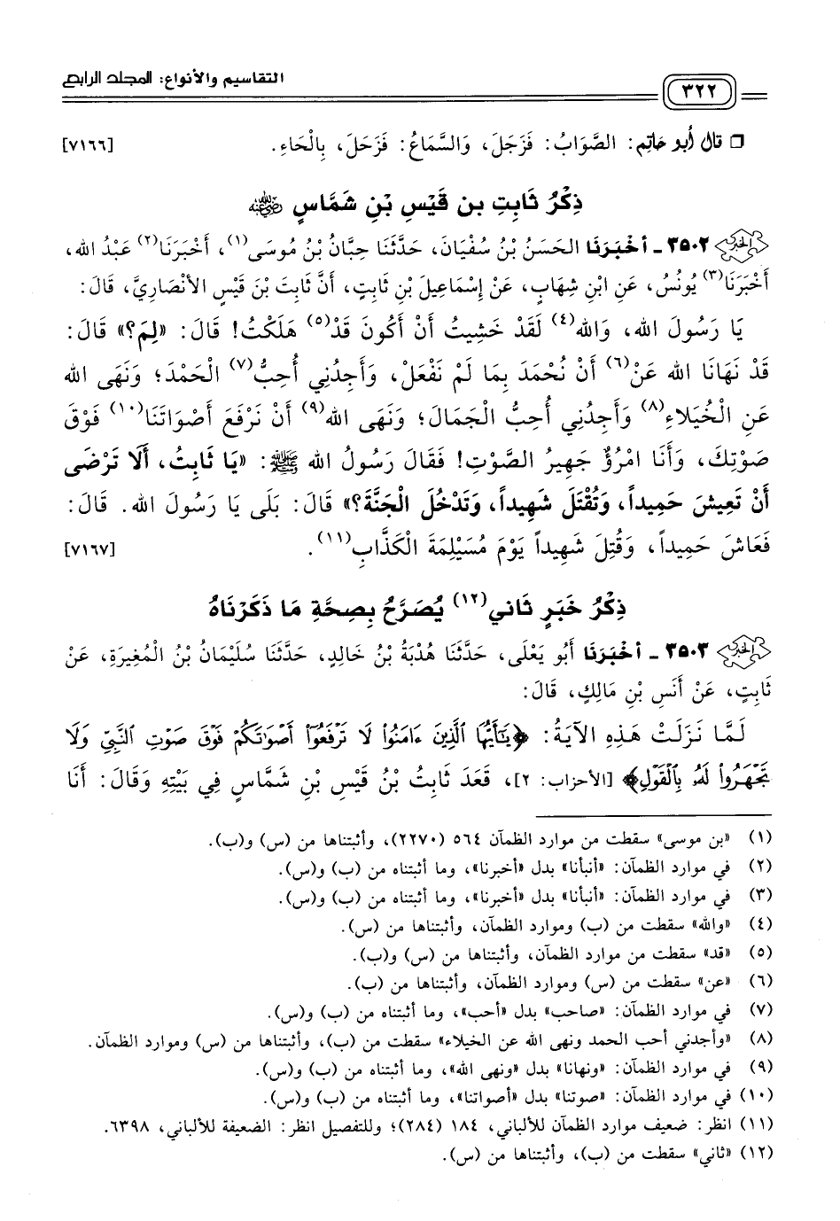 ٣٥٠٣ - أَخبَرنا أَبُو يَعْلَى، حَدثنا هُدْبَةُ بْنُ خَالِدٍ، حَدثنا سُلَيْمَانُ بْنُ الْمُغِيرَةِ، عَنْ ثَابِتٍ، عَنْ أَنَسِ بْنِ مَالِكٍ، قَالَ: لَمَّا نَزَلَتْ هَذِهِ الآيَةُ: {يَا أَيُّهَا الَّذِينَ آمَنُوا لَا تَرْفَعُوا أَصْوَاتَكُمْ فَوْقَ صَوْتِ النَّبِيِّ وَلَا تَجْهَرُوا لَهُ بِالْقَوْلِ} [الأحزاب: ٢]، قَعَدَ ثَابِتُ بْنُ قَيْسِ بْنِ شَمَّاسٍ فِي بَيْتِهِ، وَقَالَ: أَنَا الَّذِي كُنْتُ أَرْفَعُ صَوْتِي، وَأَجْهَرُ لَهُ بِالْقَوْلِ، وَأَنَا مِنْ أَهْلِ النَّارِ، فَفَقَدَهُ النَّبِيُّ صَلى الله عَلَيه وسَلم، فَأَخْبَرُوهُ، فَقَالَ: "بَلْ هُوَ مِنْ أَهْلِ الْجَنَّةِ".