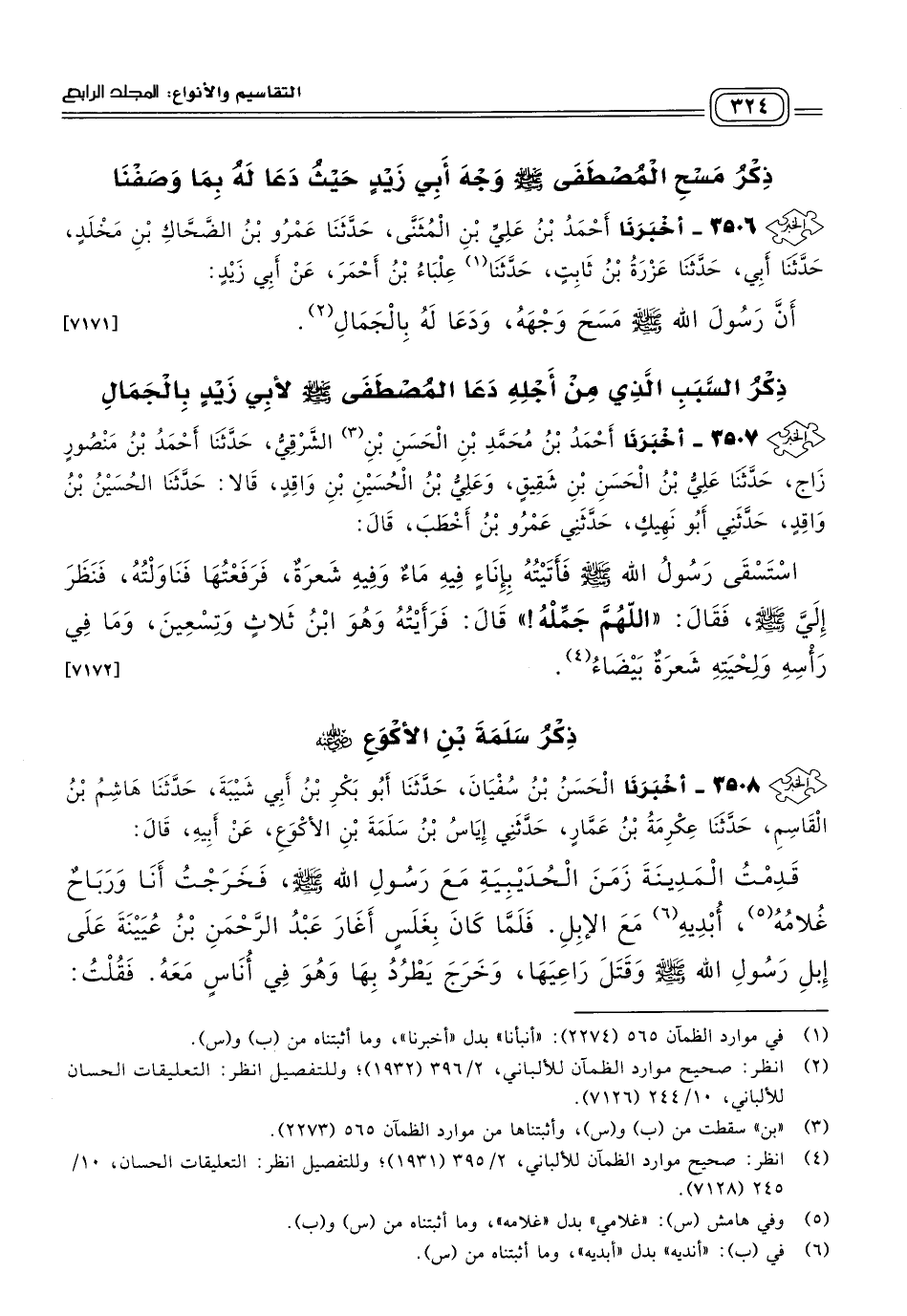٣٥٠٦ - أَخبَرنا أَحْمَدُ بْنُ عَلِيِّ بْنِ الْمُثَنَّى، حَدثنا عَمْرُو بْنُ الضَّحَّاكِ بْنِ مَخْلَدٍ، حَدثنا أَبِي، حَدثنا عَزْرَةُ بْنُ ثَابِتٍ، حَدثنا عِلْبَاءُ بْنُ أَحْمَرَ، عَنْ أَبِي زَيْدٍ، أَنَّ رَسُولَ اللهِ صَلى الله عَلَيه وسَلم مَسَحَ وَجْهَهُ، وَدَعَا لَهُ بِالْجَمَالِ. [٧١٧١]