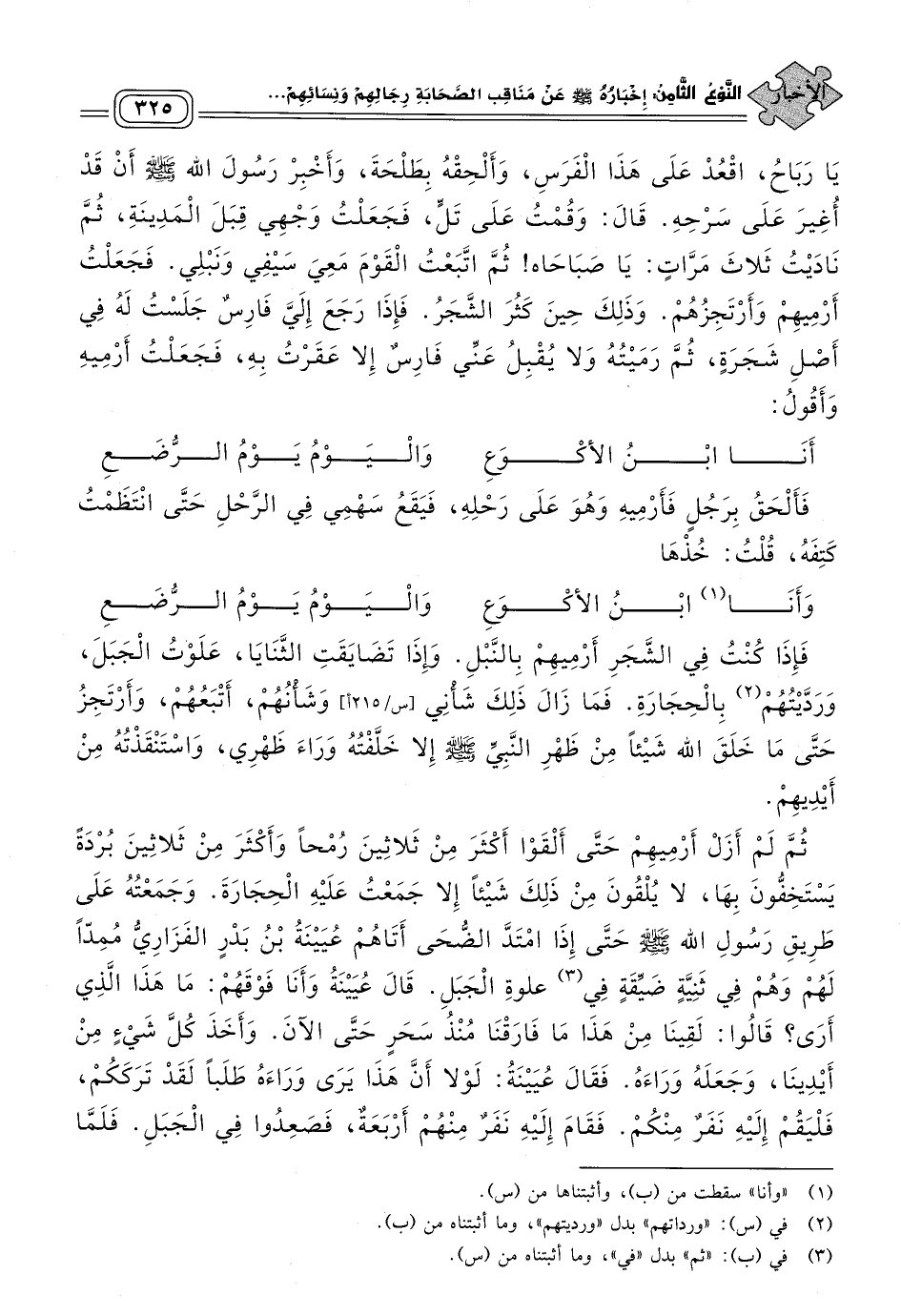 ثُمَّ لَمْ أَزَلْ أَرْمِيهِمْ حَتَّى أَلْقَوْا أَكْثَرَ مِنْ ثَلَاثِينَ رُمْحًا وَأَكْثَرَ مِنْ ثَلَاثِينَ بُرْدَةً يَسْتَخِفُّونَ بِهَا لَا يُلْقُونَ مِنْ ذَلِكَ شَيْئًا، إِلَاّ جَمَعْتُ عَلَيْهِ الْحِجَارَةَ وَجَمَعْتُهُ عَلَى طَرِيقِ رَسُولِ اللهِ صَلى الله عَلَيه وسَلم حَتَّى إِذَا امْتَدَّ الضُّحَى أَتَاهُمْ عُيَيْنَةُ بْنُ بَدْرٍ الْفَزَارِيُّ مُمِدًّا لَهُمْ وَهُمْ فِي ثَنِيَّةٍ ضَيِّقَةٍ في علوةِ الْجَبَلَ،