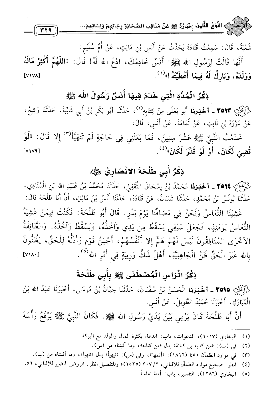 ٣٥١٥ - أَخبَرنا الْحَسَنُ بْنُ سُفْيَانَ، حَدثنا حِبَّانُ بْنُ مُوسَى، أَخبَرنا عَبْدُ اللهِ بْنُ الْمُبَارَكِ، أَخبَرنا حُمَيْدٌ الطَّوِيلُ، عَنْ أَنَسٍ، أَنَّ أَبَا طَلْحَةَ كَانَ يَرْمِي بَيْنَ يَدَيْ رَسُولِ اللهِ صَلى الله عَلَيه وسَلم، فَكَانَ النَّبِيُّ صَلى الله عَلَيه وسَلم يَرْفَعُ رَأْسَهُ مِنْ خَلْفِهِ لَيَنْظُرَ أَيْنَ يَقَعُ نَبْلُهُ، فَيَتَطَاوَلُ أَبُو طَلْحَةَ بِصَدْرِهِ يَقِي بِهِ رَسُولَ اللهِ صَلى الله عَلَيه وسَلم، وَيَقُولُ: هَكَذَا يَا نَبِيَّ اللهِ، جَعَلَنِيَ اللهُ فِدَاكَ نَحْرِي دُونَ نَحْرِكَ. [٧١٨١]