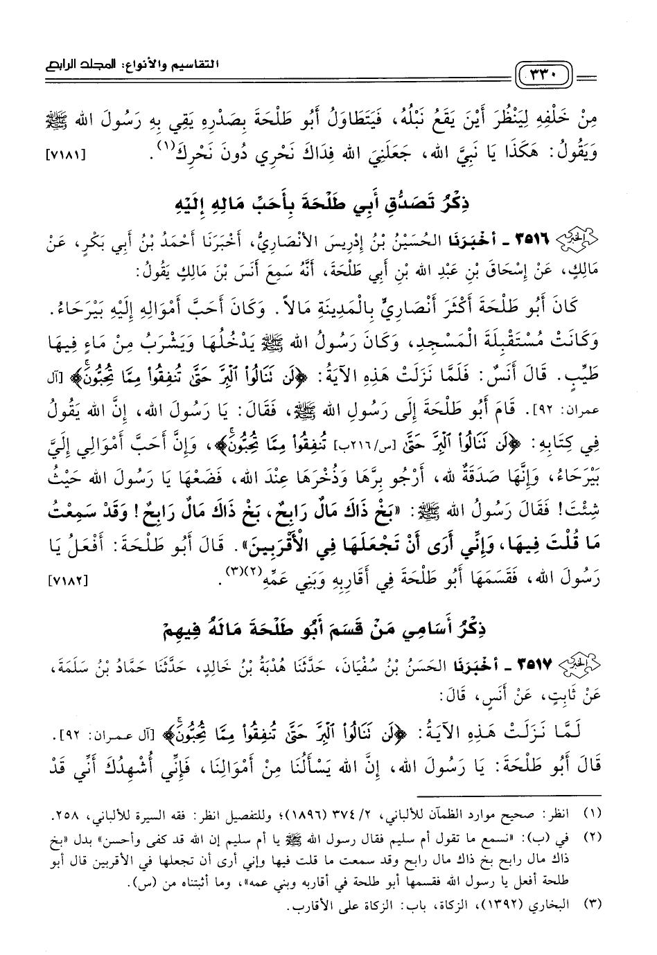 ٣٥١٧ - أَخبَرنا الْحَسَنُ بْنُ سُفْيَانَ، حَدثنا هُدْبَةُ بْنُ خَالِدٍ، حَدثنا حَمَّادُ بْنُ سَلَمَةَ، عَنْ ثَابِتٍ، عَنْ أَنَسٍ، قَالَ: لَمَّا نَزَلَتْ هَذِهِ الآيَةُ: {لَنْ تَنَالُوا الْبِرَّ حَتَّى تُنْفِقُوا مِمَّا تُحِبُّونَ} [آل عمران: ٩٢]، قَالَ أَبُو طَلْحَةَ: يَا رَسُولَ اللهِ، إِنَّ اللهَ يَسْأَلُنَا مِنْ أَمْوَالِنَا، فَإِنِّي أُشْهِدُكَ أَنِّي قَدْ جَعَلْتُ أَرْضِي وَقْفًا، قَالَ رَسُولُ اللهِ صَلى الله عَلَيه وسَلم: "اجْعَلْهَا فِي قَرَابَتِكَ"، فَقَسَمَهَا بَيْنَ حَسَّانَ بْنِ ثَابِتٍ، وَأُبَيِّ بْنِ كَعْبٍ. [٧١٨٣]