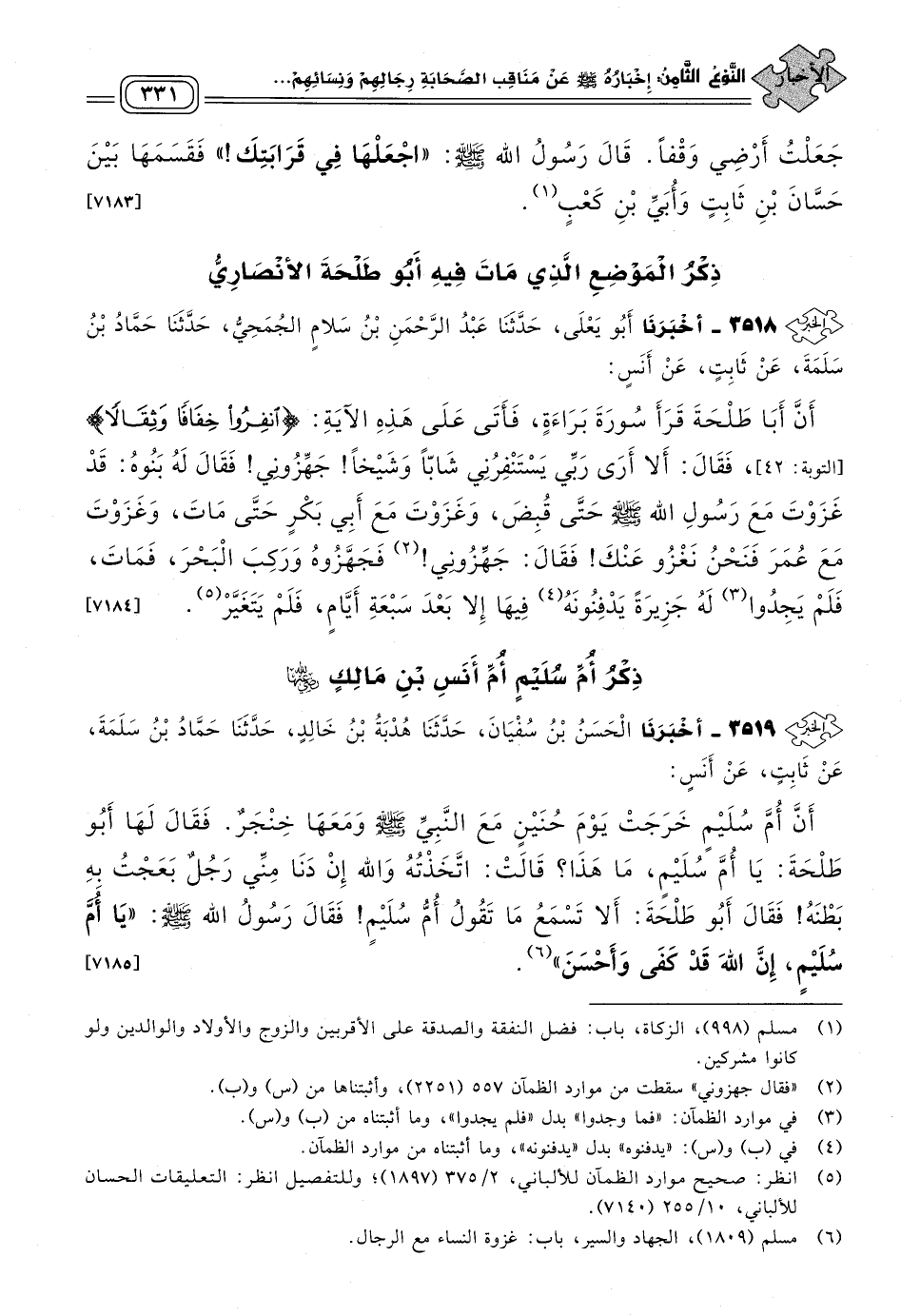 ٣٥١٨ - أخبرنا أَبُو يَعْلَى، حَدثنا عَبْدُ الرَّحْمَنِ بْنُ سَلَاّمٍ الْجُمَحِيُّ، حَدثنا حَمَّادُ بْنُ سَلَمَةَ، عَنْ ثَابِتٍ، عَنْ أَنَسٍ، أَنَّ أَبَا طَلْحَةَ قَرَأَ سُورَةَ بَرَاءَةً، فَأَتَى عَلَى هَذِهِ الآيَةِ: {انْفِرُوا خِفَافًا وَثِقَالاً} [التوبة: ٤٢]، فَقَالَ: أَلَا أَرَى رَبِّي يَسْتَنفِرُنِي شَابًّا وَشَيْخًا، جَهِّزُونِي، فَقَالَ لَهُ بَنُوهُ: قَدْ غَزَوْتَ مَعَ رَسُولِ اللهِ صَلى الله عَلَيه وسَلم حَتَّى قُبِضَ، وَغَزَوْتَ مَعَ أَبِي بَكْرٍ حَتَّى مَاتَ وَغَزَوْتَ مَعَ عُمَرَ، فَنَحْنُ نَغْزُو عَنْكَ، فَقَالَ: جَهِّزُونِي، فَجَهَّزُوهُ وَرَكِبَ الْبَحْرَ، فَمَاتَ، فَلَمْ يَجِدُوا لَهُ جَزِيرَةً يَدْفِنُونَهُ فِيهَا إِلَاّ بَعْدَ سَبْعَةِ أَيَّامٍ فَلَمْ يَتَغَيَّرْ. [٧١٨٤]