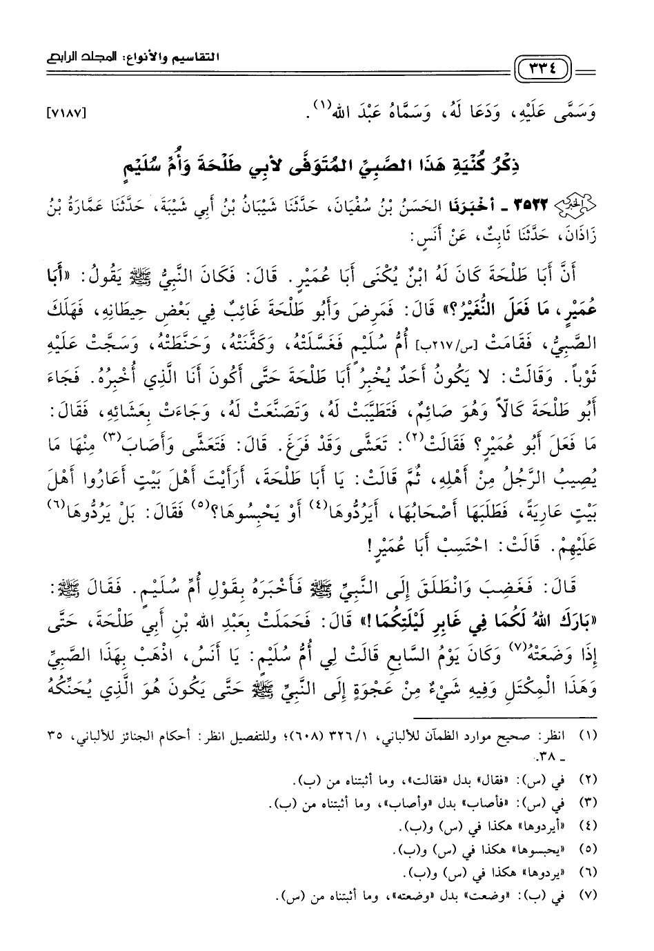 ٣٥٢٢ - أَخبَرنا الْحَسَنُ بْنُ سُفْيَانَ، حَدثنا شَيْبَانُ بْنُ أَبِي شَيْبَةَ، حَدثنا عُمَارَةُ بْنُ زَاذَانَ، حَدثنا ثَابِتٌ، عَنْ أَنَسٍ، أَنَّ أَبَا طَلْحَةَ كَانَ لَهُ ابْنٌ يُكْنَى أَبَا عُمَيْرٍ، قَالَ: فَكَانَ النَّبِيُّ صَلى الله عَلَيه وسَلم يَقُولُ: "أَبَا عُمَيْرٍ مَا فَعَلَ النُّغَيْرُ؟ " قَالَ: فَمَرِضَ وَأَبُو طَلْحَةَ غَائِبٌ فِي بَعْضِ حِيطَانِهِ، فَهَلَكَ الصَّبِيُّ، فَقَامَتْ أُمُّ سُلَيْمٍ، فَغَسَّلَتْهُ، وَكَفَّنَتْهُ وَحَنَّطَتْهُ وَسَجَّتْ عَلَيْهِ ثَوْبًا، وَقَالَتْ: لَا يَكُونُ أَحَدٌ يُخْبِرُ أَبَا طَلْحَةَ حَتَّى أَكُونَ أَنَا الَّذِي أُخْبِرُهُ، فَجَاءَ أَبُو طَلْحَةَ كَالاًّ وَهُوَ صَائِمٌ، فَتَطَيَّبَتْ لَهُ وَتَصَنَّعَتْ لَهُ وَجَاءَتْ بِعَشَائِهِ، فَقَالَ: مَا فَعَلَ أَبُو عُمَيْرٍ؟ فَقَالَتْ: تَعَشَّى وَقَدْ فَرَغَ، قَالَ: فَتَعَشَّى وَأَصَابَ مِنْهَا مَا يُصِيبُ الرَّجُلُ مِنْ أَهْلِهِ،