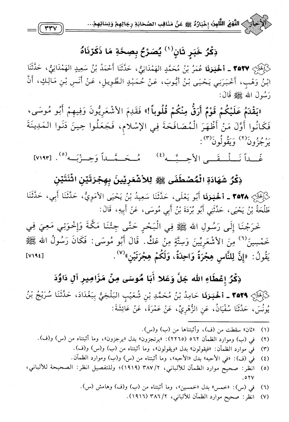 ذِكْرُ شَهَادَةِ الْمُصْطَفَى صَلى الله عَلَيه وسَلم لِلأَشْعَرِيِّينَ بِهِجْرَتَيْنِ اثْنَتَيْنِ.