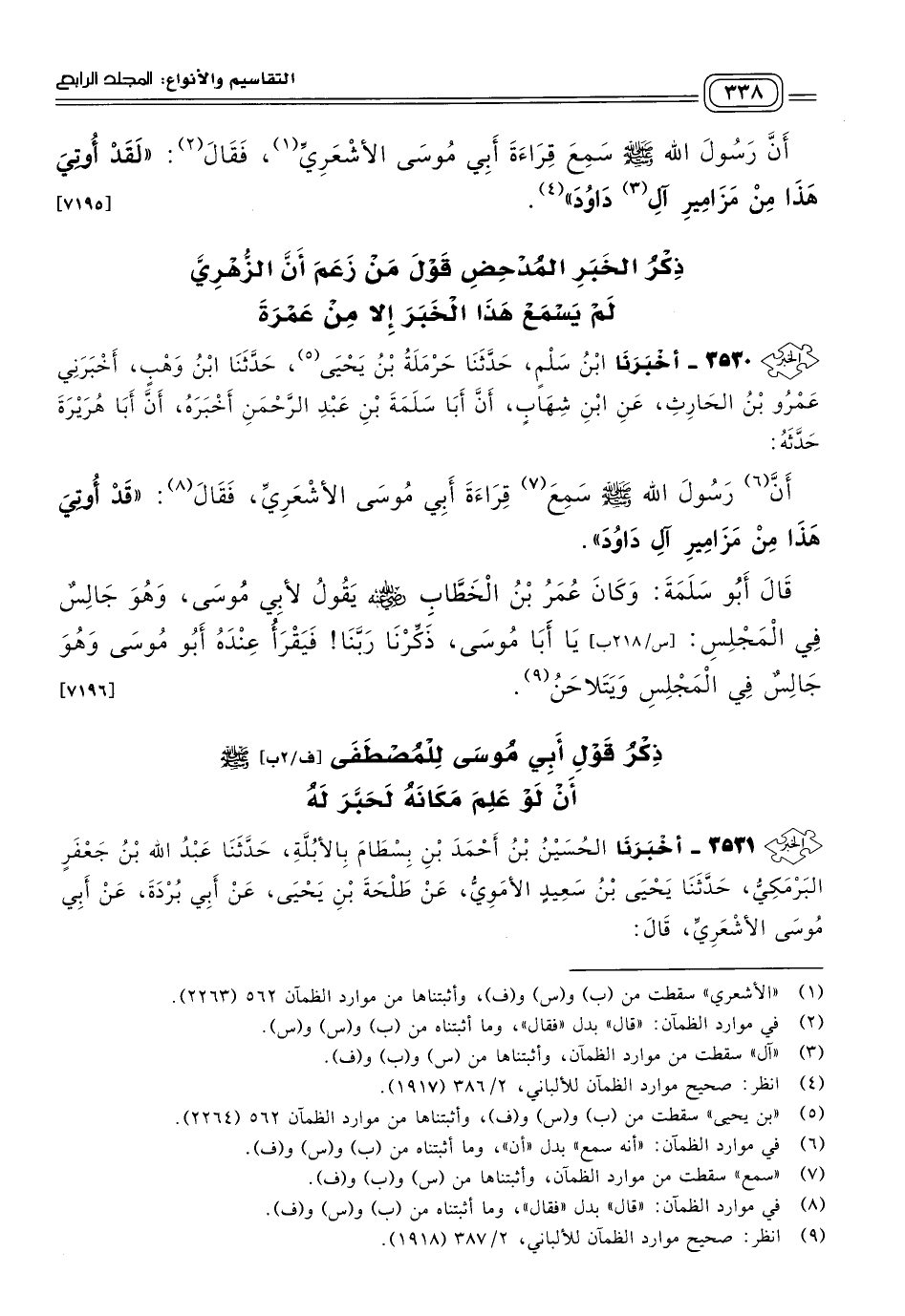 ٣٥٣١ - أَخبَرنا الْحُسَيْنُ بْنُ أَحْمَدَ بْنِ بِسْطَامٍ، بِالأُبُلَّةِ، حَدثنا عَبْدُ اللهِ بْنُ جَعْفَرٍ الْبَرْمَكِيُّ، حَدثنا يَحْيَى بْنُ سَعِيدٍ الأُمَوِيُّ، عَنْ طَلْحَةَ بْنِ يَحْيَى، عَنْ أَبِي بُرْدَةَ، عَنْ أَبِي مُوسَى الأَشْعَرِيِّ، قَالَ: اسْتَمَعَ رَسُولُ اللهِ صَلى الله عَلَيه وسَلم قِرَاءَتِي مِنَ اللَّيْلِ، فَلَمَّا أَصْبَحْتُ، قَالَ: "يَا أَبَا مُوسَى، اسْتَمَعْتُ قِرَاءَتَكَ اللَّيْلَةَ، لَقَدْ أُوتِيتَ مِزْمَارًا مِنْ مَزَامِيرِ آلِ دَاوُدَ"، قُلْتُ: يَا رَسُولَ اللهِ، لَوْ عَلِمْتُ مَكَانَكَ لَحَبَّرْتُ لَكَ تَحْبِيرًا. [٧١٩٧]