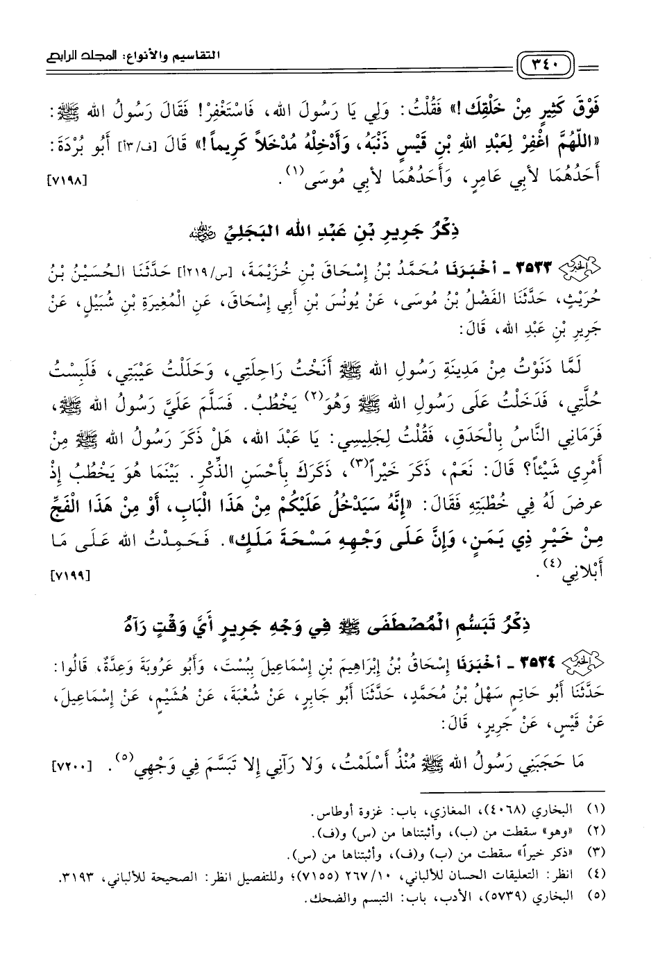 ٣٥٣٤ - أَخبَرنا إِسْحَاقُ بْنُ إِبْرَاهِيمَ بْنِ إِسْمَاعِيلَ، بِبُسْتٍ، وَأَبُو عَرُوبَةَ، وَعِدَّةٌ، قَالُوا: حَدثنا أَبُو حَاتِمٍ سَهْلُ بْنُ مُحَمَّدٍ، حَدثنا أَبُو جَابِرٍ، عَنْ شُعْبَةَ، عَنْ هُشَيْمٍ، عَنْ إِسْمَاعِيلَ، عَنْ قَيْسٍ، عَنْ جَرِيرٍ، قَالَ: مَا حَجَبَنِي رَسُولُ اللهِ صَلى الله عَلَيه وسَلم مُنْذُ أَسْلَمْتُ، وَلَا رَآنِي إِلَاّ تَبَسَّمَ فِي وَجْهِي. [٧٢٠٠]