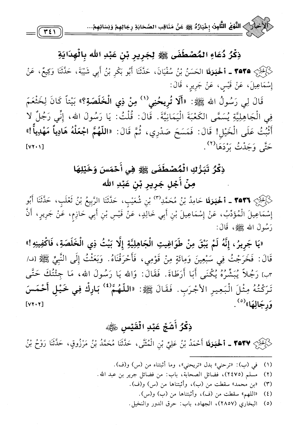 ٣٥٣٦ - أَخبَرنا حَامِدُ بْنُ مُحَمَّدِ بْنِ شُعَيْبٍ، حَدثنا الرَّبِيعُ بْنُ ثَعْلَبٍ، حَدثنا أَبُو إِسْمَاعِيلَ الْمُؤَدِّبُ، عَنْ إِسْمَاعِيلَ بْنِ أَبِي خَالِدٍ، عَنْ قَيْسِ بْنِ أَبِي حَازِمٍ، عَنْ جَرِيرٍ؛ أَنَّ رَسُولَ اللهِ صَلى الله عَلَيه وسَلم، قَالَ: "يَا جَرِيرُ، إِنَّهُ لَمْ يَبْقَ مِنْ طَوَاغِيتِ الْجَاهِلِيَّةِ إِلَاّ بَيْتُ ذِي الْخَلَصَةِ، فَاكْفِينِهِ"، قَالَ: فَخَرَجْتُ فِي سَبْعِينَ وَمِائَةٍ مِنْ قَوْمِي، فَأَحْرَقْنَاهُ، وَبَعَثْتُ إِلَى النَّبِيِّ صَلى الله عَلَيه وسَلم رَجُلاً يُبَشِّرُهُ يُكْنَى أَبَا أَرْطَاةَ، فَقَالَ: وَاللهِ يَا رَسُولَ اللهِ، مَا جِئْتُكَ حَتَّى تَرَكْتُهُ مِثْلَ الْبَعِيرِ الأَجْرَبِ، فَقَالَ صَلى الله عَلَيه وسَلم: "اللهُمَّ بَارِكْ فِي خَيْلِ أَحْمَسَ وَرِجَالِهَا". [٧٢٠٢]