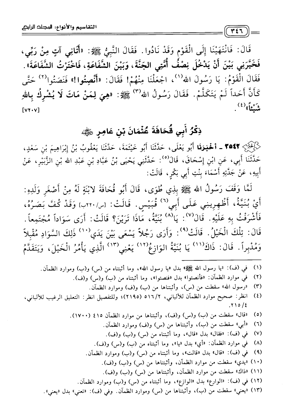 ٣٥٤٢ - أَخبَرنا أَبُو يَعْلَى، حَدثنا أَبُو خَيْثَمَةَ، حَدثنا يَعْقُوبُ بْنُ إِبْرَاهِيمَ بْنِ سَعْدٍ، حَدثنا أَبِي، عَنِ ابْنِ إِسْحَاقَ، قال: حَدَّثَنِي يَحْيَى بْنُ عَبَّادِ بْنِ عَبْدِ اللهِ بْنِ الزُّبَيْرِ، عَنْ أَبِيهِ، عَنْ جَدَّتِهِ أَسْمَاءَ بِنْتِ أَبِي بَكْرٍ، قَالَتْ: لَمَّا وَقَفَ رَسُولُ اللهِ صَلى الله عَلَيه وسَلم بِذِي طُوًى، قَالَ أَبُو قُحَافَةَ لَابْنَةٍ لَهُ مِنْ أَصْغَرِ وَلَدِهِ: أَيْ بُنَيَّةُ أَظْهِرِينِي عَلَى أَبِي قُبَيْسٍ، قَالَتْ: وَقَدْ كُفَّ بَصَرُهُ، فَأَشْرَفْتُ بِهِ عَلَيْهِ، قَالَ: يَا بُنَيَّةُ، مَاذَا تَرَيْنَ؟ قَالَتْ: أَرَى سَوَادًا مُجْتَمِعًا، قَالَ: تِلْكَ الْخَيْلُ، قَالَتْ: وَأَرَى رَجُلاً يَسْعَى بَيْنَ يَدَيْ ذَلِكَ السَّوَادِ مُقْبِلاً وَمُدْبِرًا، قَالَ: ذَاكَ يَا بُنَيَّةُ الْوَازِعُ الَّذِي يَأْمُرُ الْخَيْلَ، وَيَتَقَدَّمُ إِلَيْهَا، ثُمَّ قَالَتْ: قَدْ وَاللهِ انْتَشَرَ السَّوَادُ، فَقَالَ: قَدْ وَاللهِ دُفِعَتِ الْخَيْلُ، فَأَسْرِعِي بِي إِلَى بَيْتِي، فَانْحَطَّتْ بِهِ،