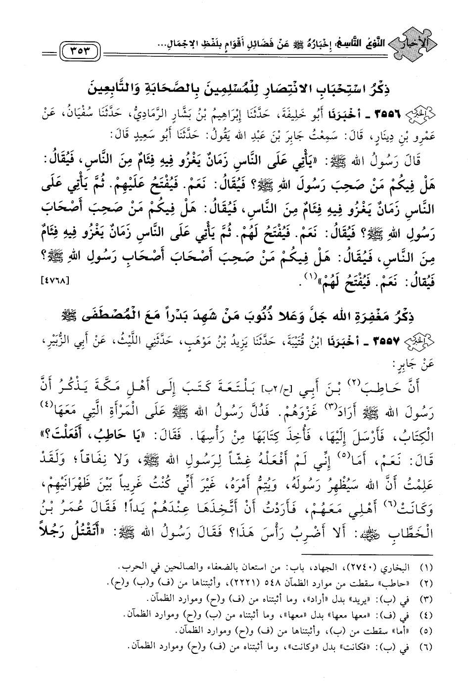 ٣٥٥٦ - أَخبَرنا أَبُو خَلِيفَةَ، حَدثنا إِبْرَاهِيمُ بْنُ بَشَّارٍ الرَّمَادِيُّ، حَدثنا سُفْيَانُ، عَنْ عَمْرِو بْنِ دِينَارٍ، قَالَ: سَمِعْتُ جَابِرَ بْنَ عَبْدِ اللهِ، يَقُولُ: حَدثنا أَبُو سَعِيدٍ، قَالَ: قَالَ رَسُولُ اللهِ صَلى الله عَلَيه وسَلم: "يَأْتِي عَلَى النَّاسِ زَمَانٌ يَغْزُو فِيهِ فِئَامٌ مِنَ النَّاسِ، فَيُقَالُ: هَلْ فِيكُمْ مَنْ صَحِبَ رَسُولَ اللهِ صَلى الله عَلَيه وسَلم؟ فَيُقَالُ: نَعَمْ، فَيُفْتَحُ عَلَيْهِمْ، ثُمَّ يَأْتِي عَلَى النَّاسِ زَمَانٌ يَغْزُو فِيهِ فِئَامٌ مِنَ النَّاسِ، فَيُقَالُ: هَلْ فِيكُمْ مَنْ صَحِبَ أَصْحَابَ رَسُولِ اللهِ صَلى الله عَلَيه وسَلم؟ فَيُقَالُ: نَعَمْ، فَيُفْتَحُ لَهُمْ، ثُمَّ يَأْتِي عَلَى النَّاسِ زَمَانٌ يَغْزُو فِيهِ فِئَامٌ مِنَ النَّاسِ، فَيُقَالُ: هَلْ فِيكُمْ مَنْ صَحِبَ أَصْحَابَ أَصْحَابِ رَسُولِ اللهِ صَلى الله عَلَيه وسَلم، فَيُقَالُ: نَعَمْ، فَيُفْتَحُ لَهُمْ". [٤٧٦٨]