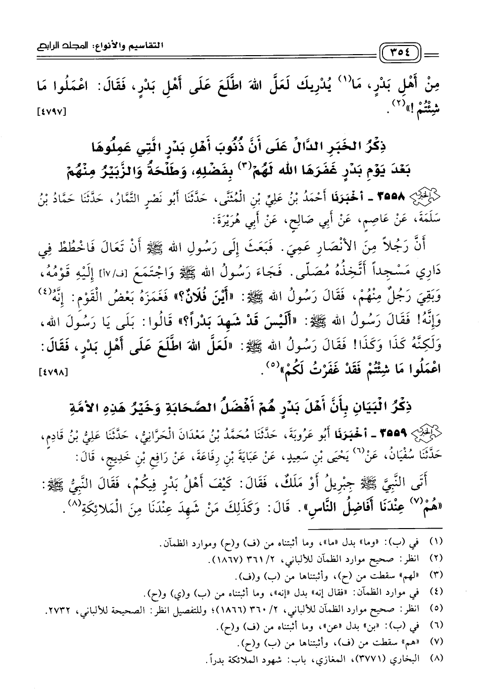 ذِكْرُ الْخَبَرِ الدَّالِّ عَلَى أَنَّ ذُنُوبَ أَهْلِ بَدْرٍ الَّتِي عَمِلُوهَا بَعْدَ يَوْمِ بَدْرٍ غَفَرَهَا اللهُ لَهُمْ بِفَضْلِهِ، وَطَلْحَةُ وَالزُّبَيْرُ مِنْهُمْ.